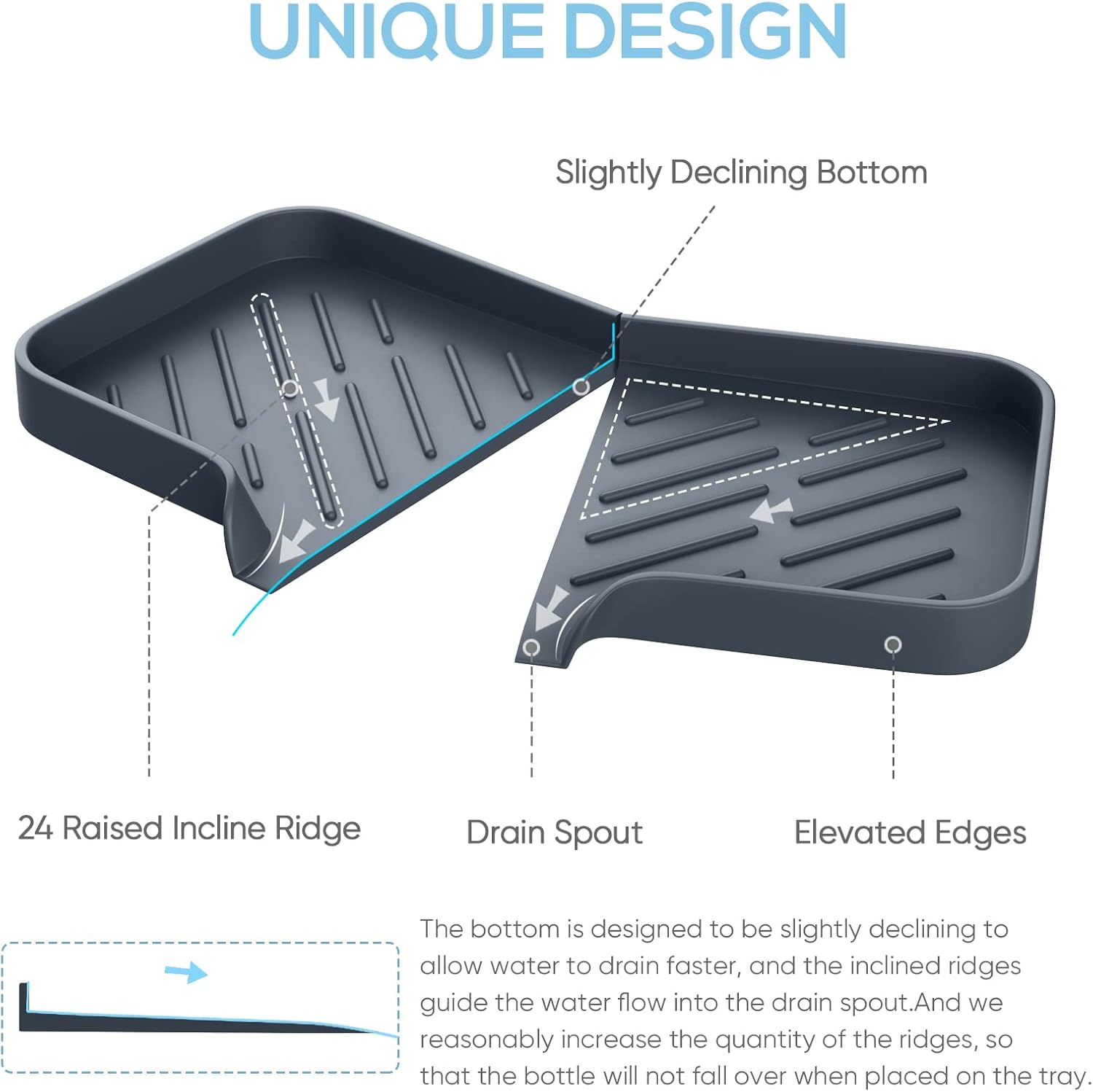 • 【Thoughtful and Unique Design】 Unique self-draining design, the bottom of the soap tray for kitchen sink is designed to be slightly declining to allow water to drain faster, the inclined ridges guide the water flow into the drain spout. And we reasonably increase the quantity of the ridges, so that the bottle will not fall over when placed on this kitchen sink storage tray organizer. All these unique features are specially designed after many tests.