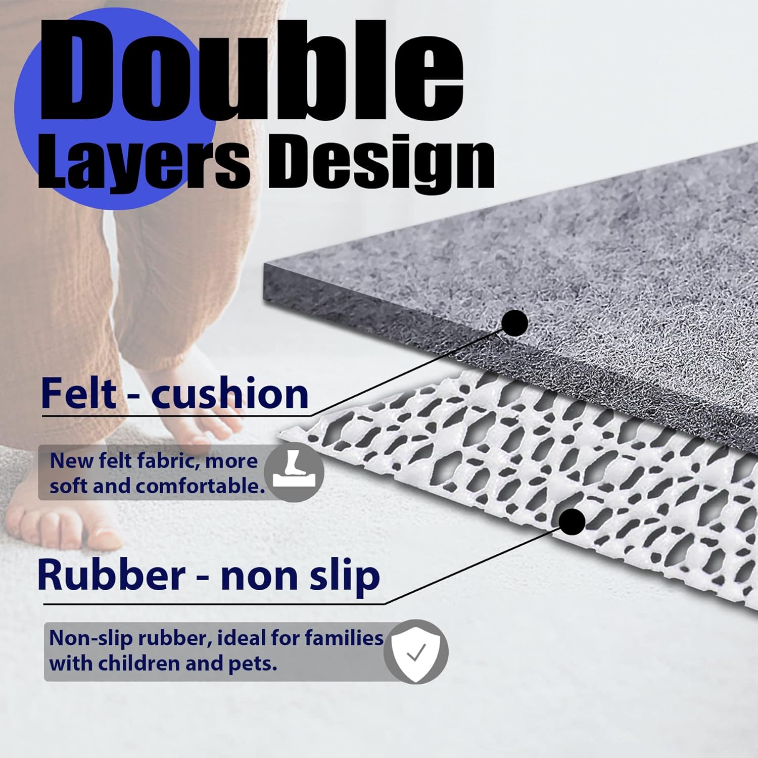 • 🏠 UNIQUE DOUBLE LAYER DESIGN: After a long period of research and testing, Enjoy Holiday 1981 The team developed the reliable double layer rug pad. The unique double layer design of Felt + Rubber adds extra thick cushion, which helps with sound absorption and insulation. The rubber layer holds the hard floor firmly and prevents the carpet from moving. Give your carpet a thick soft sumptuous feel underfoot.