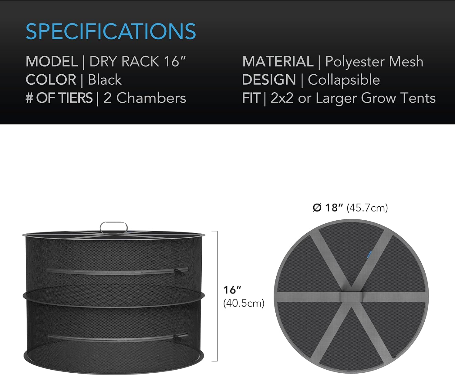 • 2 Tiers | 18 in. Diameter | Fits 2x2 or Larger Grow Tents | Includes Hanging Hook & Carrying Bag