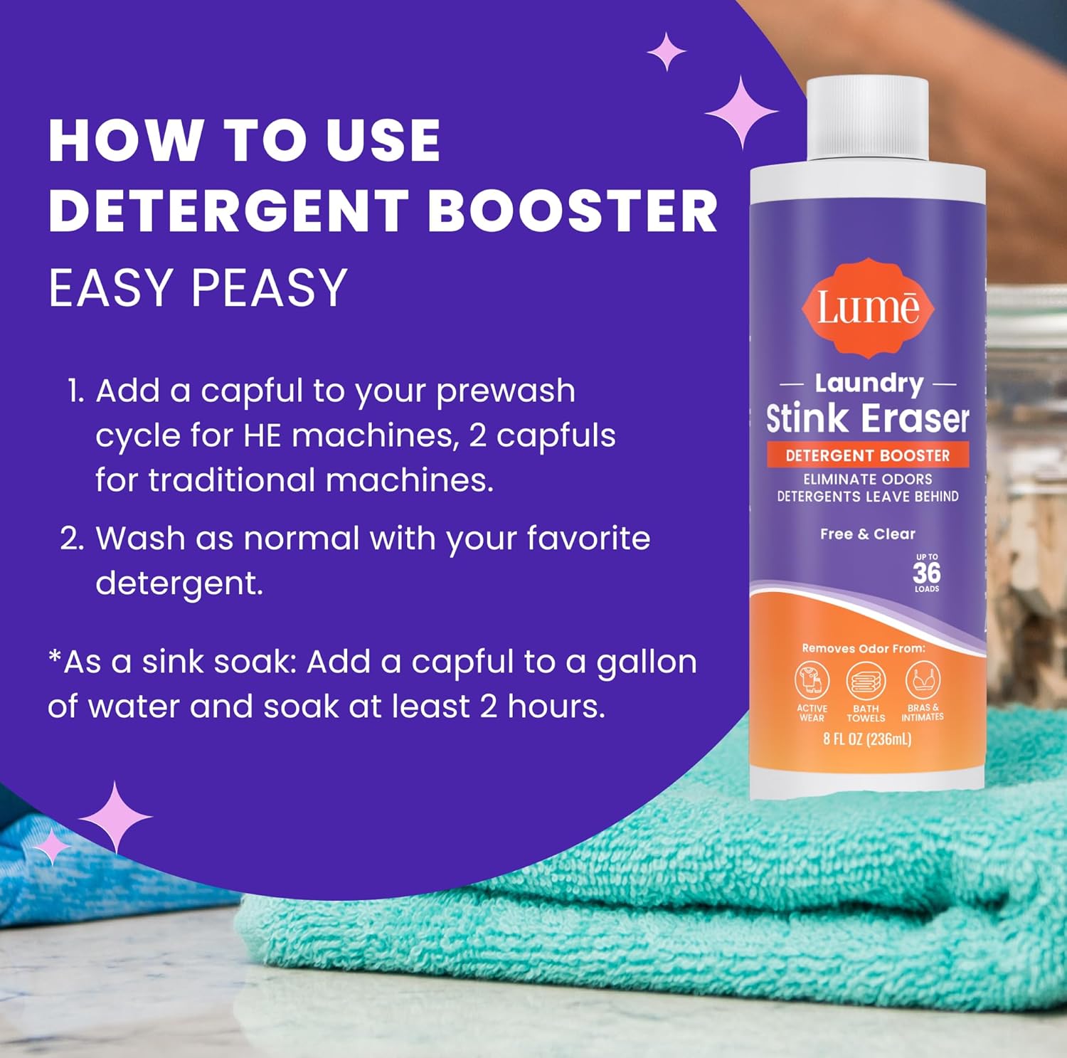 • MAKE YOUR DETERGENT WORK BETTER - Lume Laundry Stink Eraser is a highly concentrated enzyme blend Pretreat Spray that breaks down odor trapped in clothes so your detergent can wash it away.