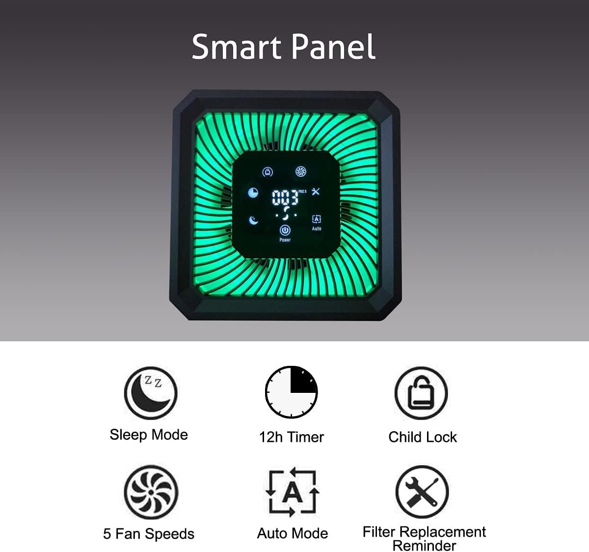 • Air Quality Sensor: The brightly colored LED provides air quality feedback through high precision air quality sensor that monitor air particles in your room, and it features a timer for 1-12 hours. It has a filter life time indicator to let users to be aware of when to replace the filter