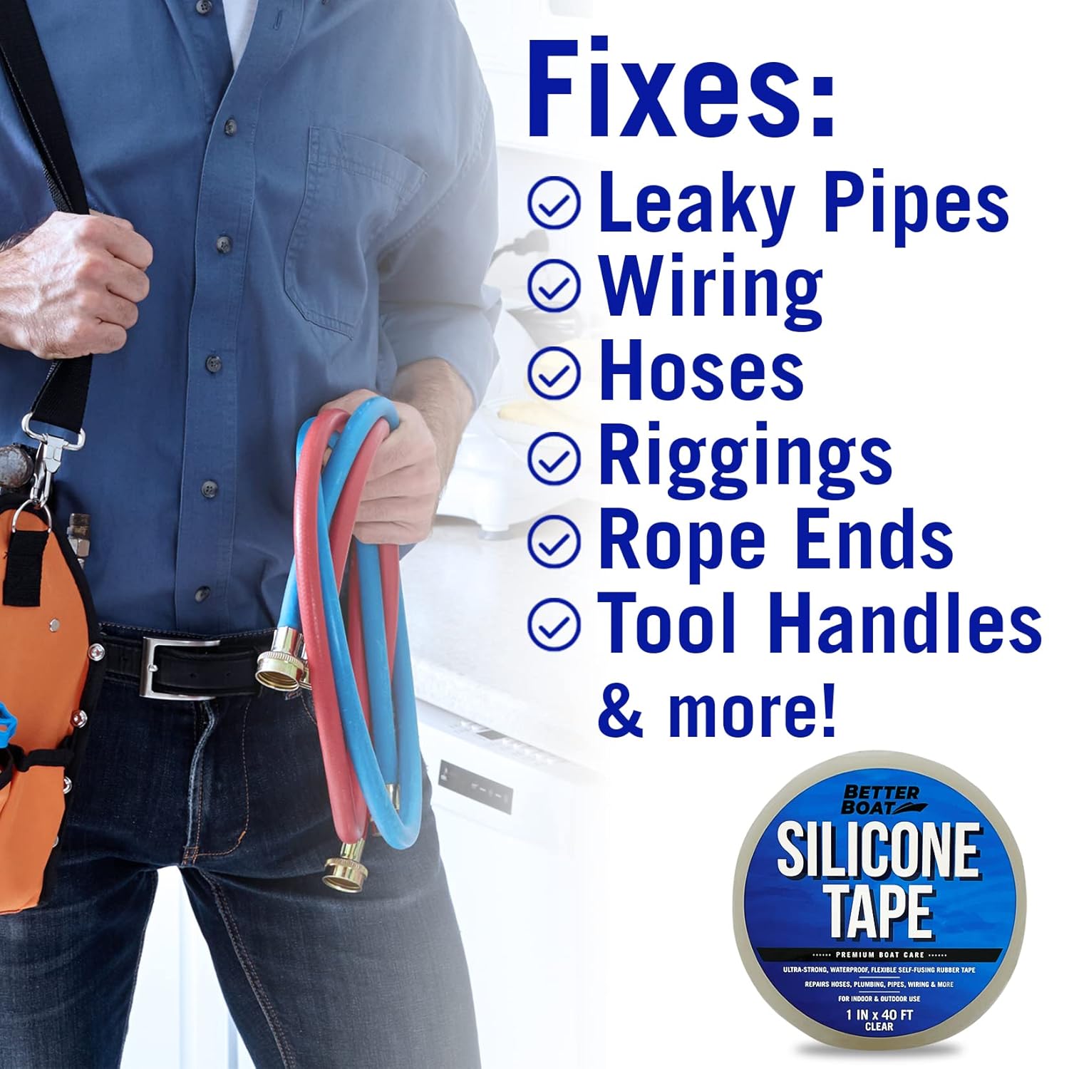 • PERFECT FOR RESCUE REPAIRS: Our premium grade self fusing silicone tape for plumbing, electrical and more is 1in x 40ft and clear. 100% silicone making it ideal as rubber electrical tape, wrapping rope ends and grip tool handles and even waterproof tape for leaks and plubming.