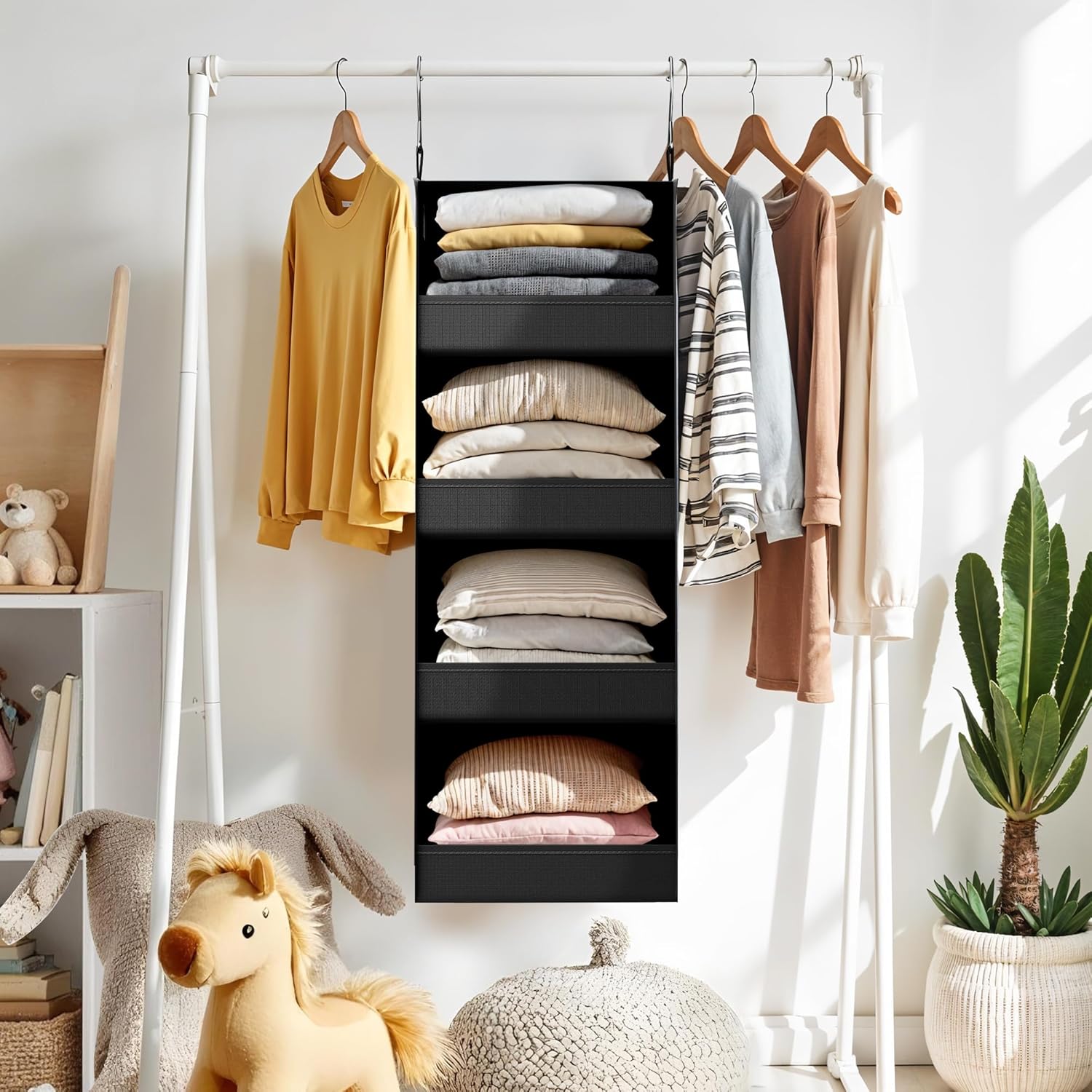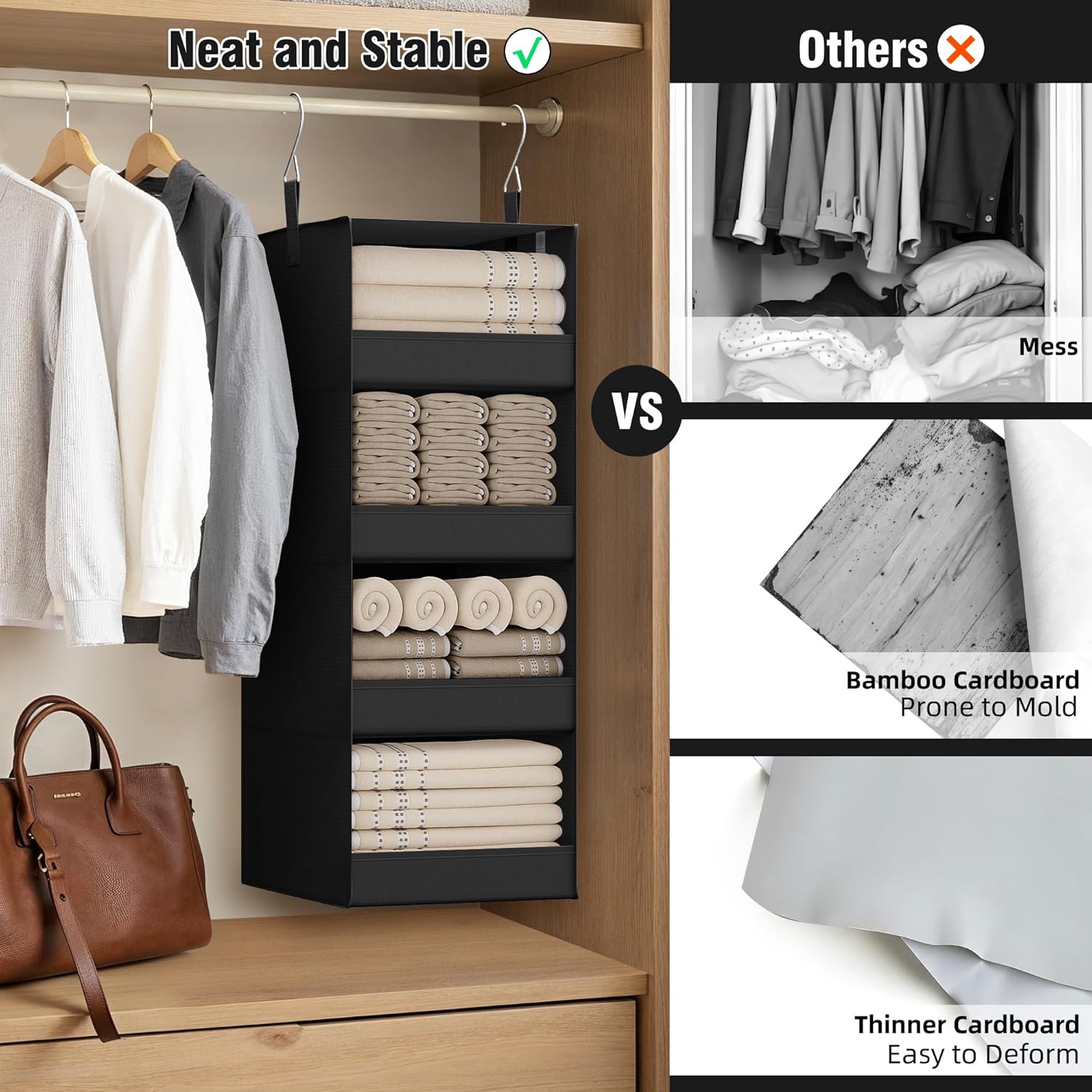 • Save Time and Space: Open hanging wardrobe shelves allow for easy storage, display and organization, saving time by providing visibility into your wardrobe contents. 4 shelves organizers work great in closets, shelves and wardrobes for storing clothes, towels, underwear, hats, socks, accessories, shoes, etc.