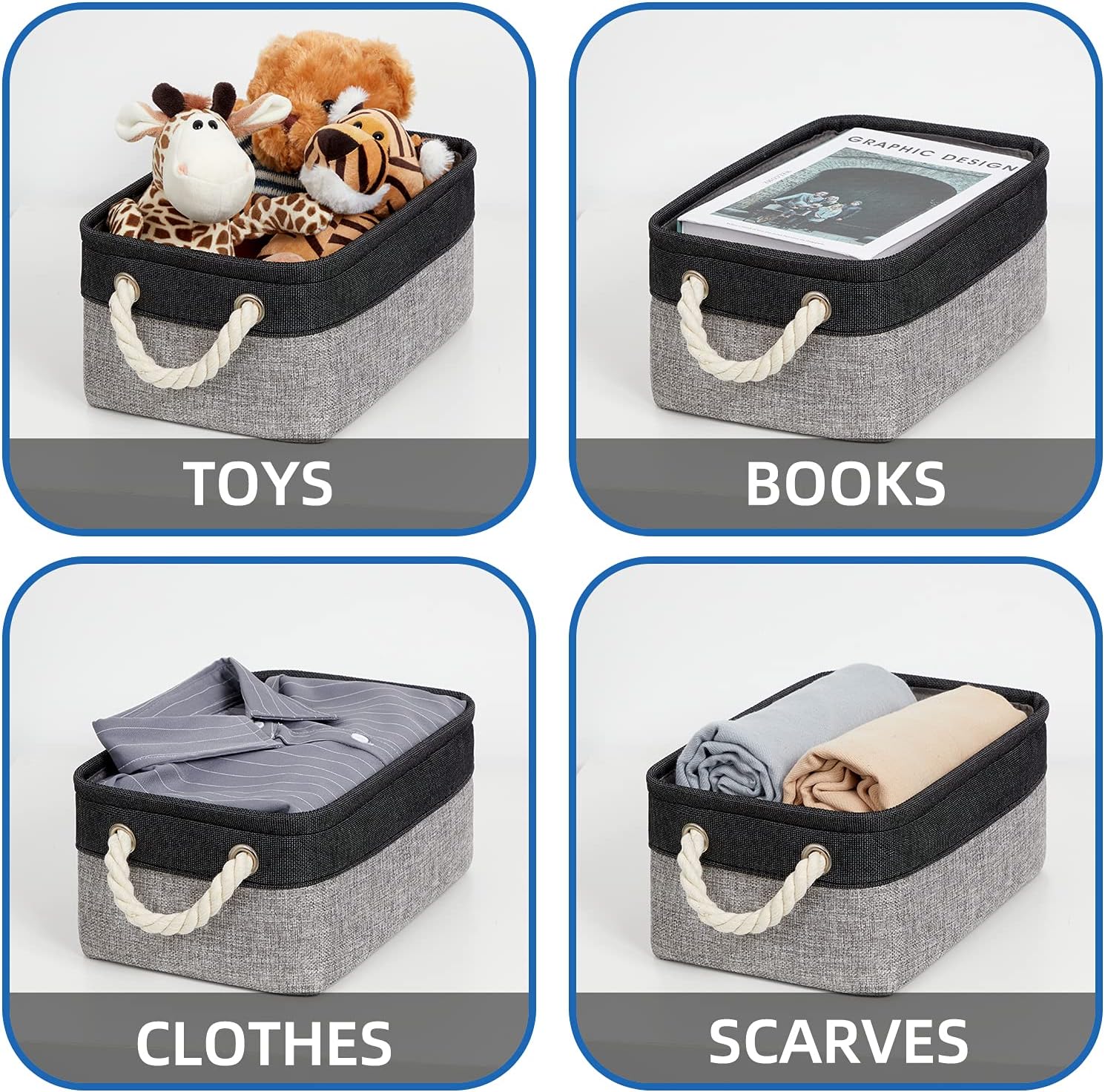 • PREMIUM QUALITY MATERIALS: The fabric storage baskets are made of sturdy fabric, which is more textured than ordinary plastic bins. The top is reinforced with a metal support frame, and the bottom of the small storage basket is reinforced with heavy-duty stitching to maintain the shape of the clothes basket. The sturdy rope handles provide a strong and comfortable grip for easy pulling and carrying to ensure they can serve you for a long time