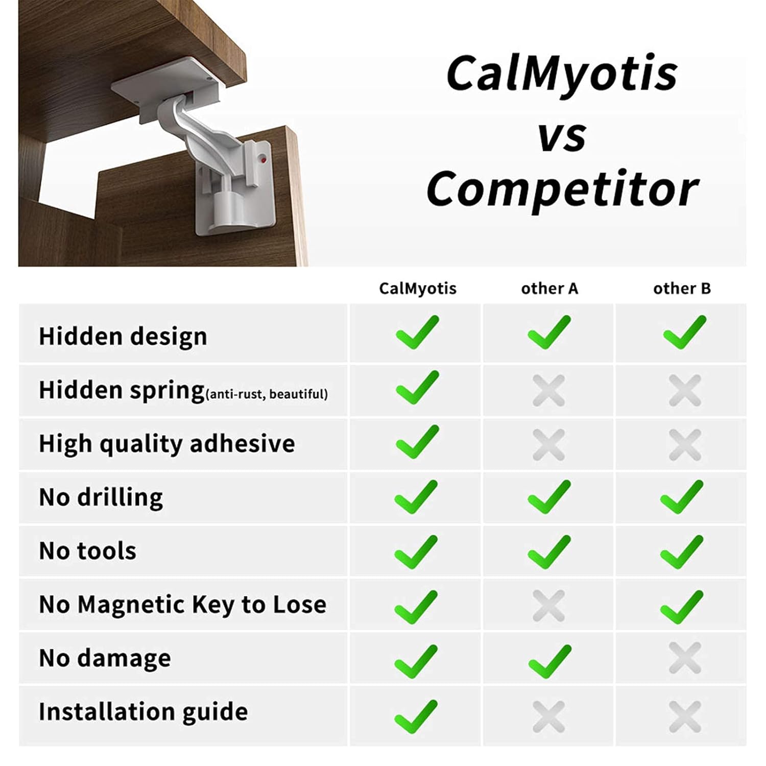 • Sturdier Build: Don’t settle for second best! Magnet locks are notorious for breaking within days. Some safety locks have to be bent down to unlatch, so over time they stay bent & stop working. We use a strong internal spring that makes unlatching easy (for adults!), and keeps our locks working perfectly.