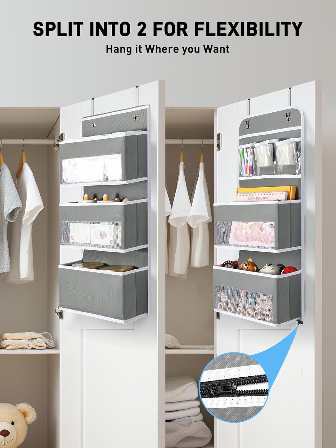 • 1 Long Split into 2 Short: Allows you to use as one 6-shelf diaper baby organizer that runs the full length of your door for dedicated storage in one place, or split it into two 3-shelf ones for flexible uses in a small closet, bathroom, camper, RV, baby room or where space is limited