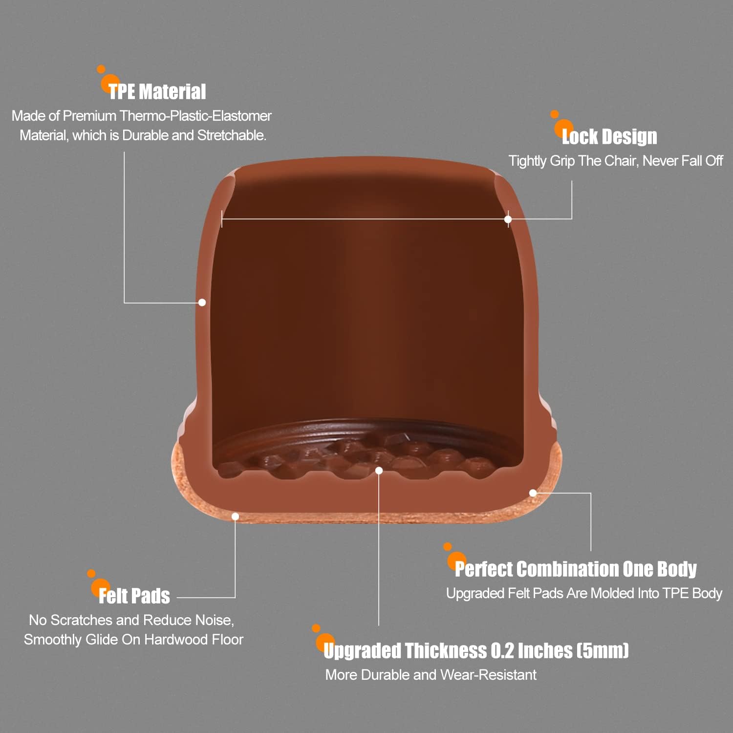 Ezprotekt 24 Pcs Square Chair Leg Floor Protectors with Felt, Silicone Felt Furniture Pads Cups for Hardwood Floor, Dining Table Leg Caps Covers No Scratches (L Fit: 1" to 1.4", Brown)