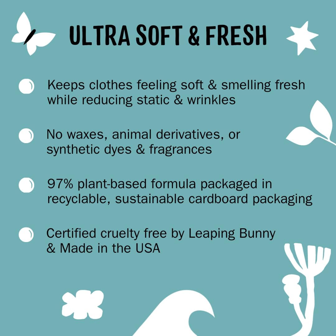 • SOFT-STATIC FREE CLOTHES: Our 97% plant-based dryer sheets employ a gentle fabric softening technology to leave clothes feeling fresh, cozy, and comfy. Better for people with sensitive skin, the environment, and your dryer, these dryer sheets effectively eliminate static so you and your clothes look and feel your best