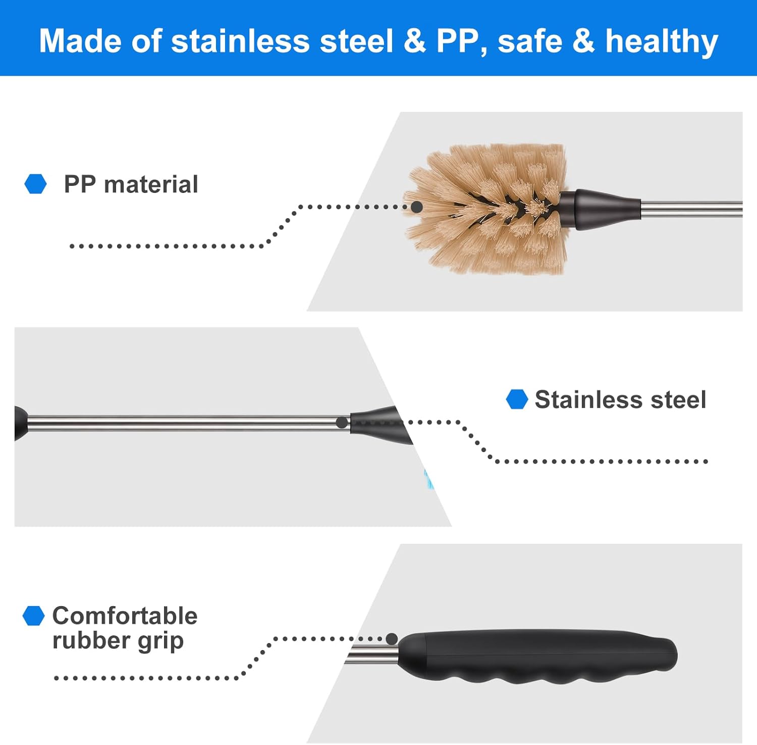 • Premium Brush Set - Features scratch-resistant, odor-free nylon bristles. The flexible stainless steel handle with ergonomic grip design enables easy control of the long-handled brush head to reach every corner inside bottles. It effectively removes stubborn stains at the bottom and in hard-to-reach corners, while the blue bristles efficiently clean the bottle body.