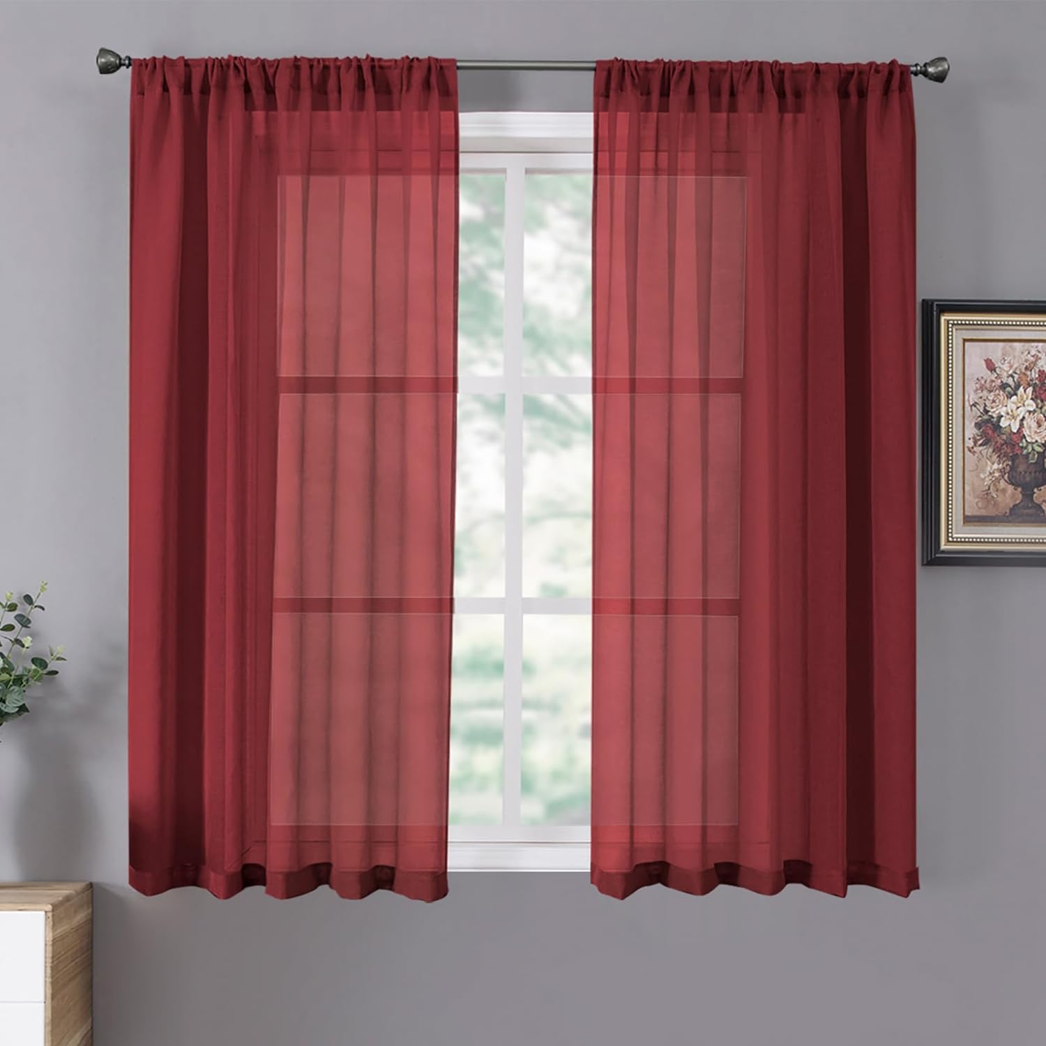 Tollpiz Short Sheer Curtain Linen Textured Living Room Curtains Sheer Light Filtering Rod Pocket Voile Curtain for Bedroom, 42 x 54 inches Long, Burgundy Red, Set of 2 Panels