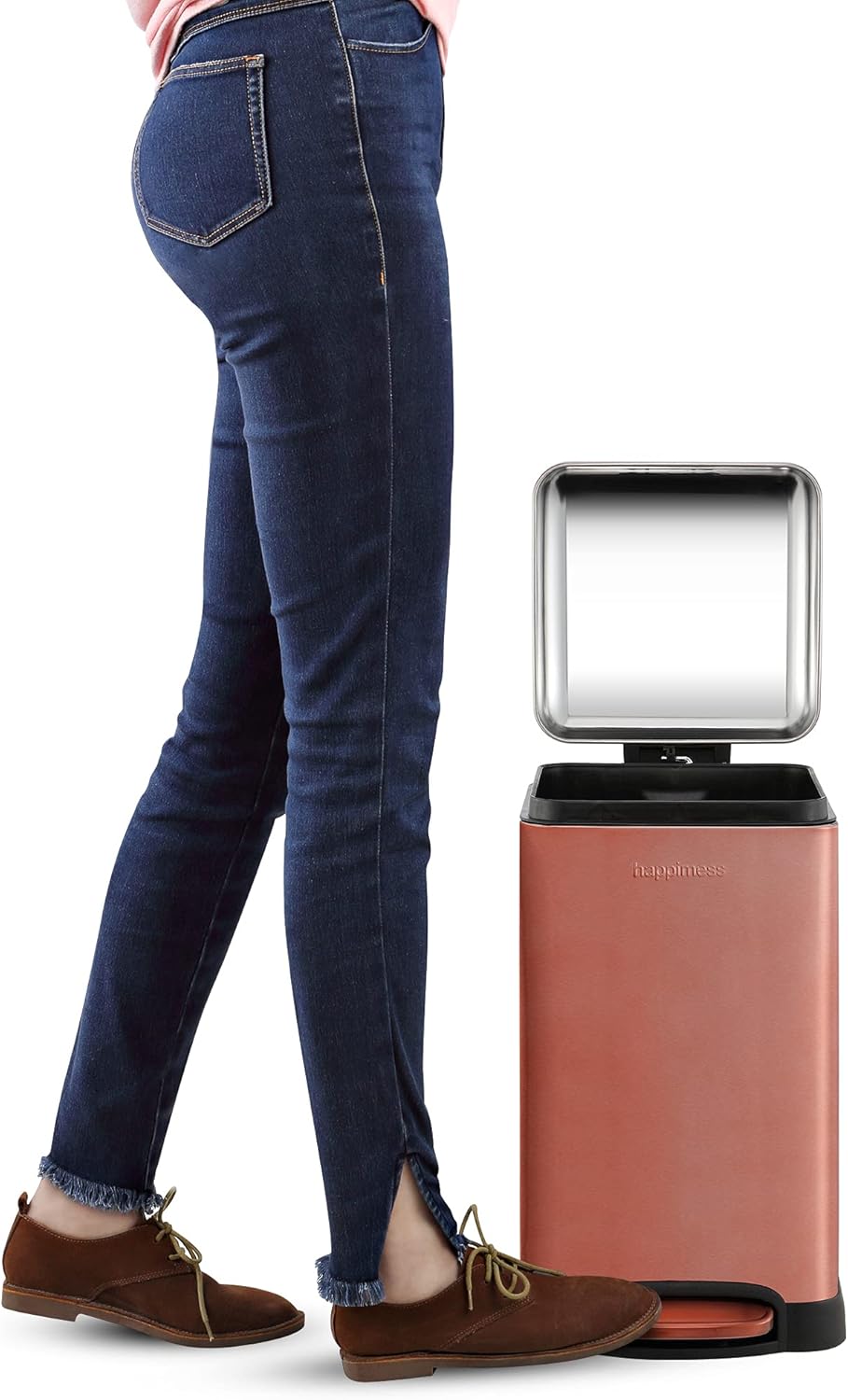 • STYLISH & PRACTICAL DESIGN: happimess Trash Cans clean-lined designs blend beautifully into your existing decor; Dispose of trash hands-free with our convenient step pedal; built-in damper lowers the lid quietly, and closes it tightly to keep odors inside