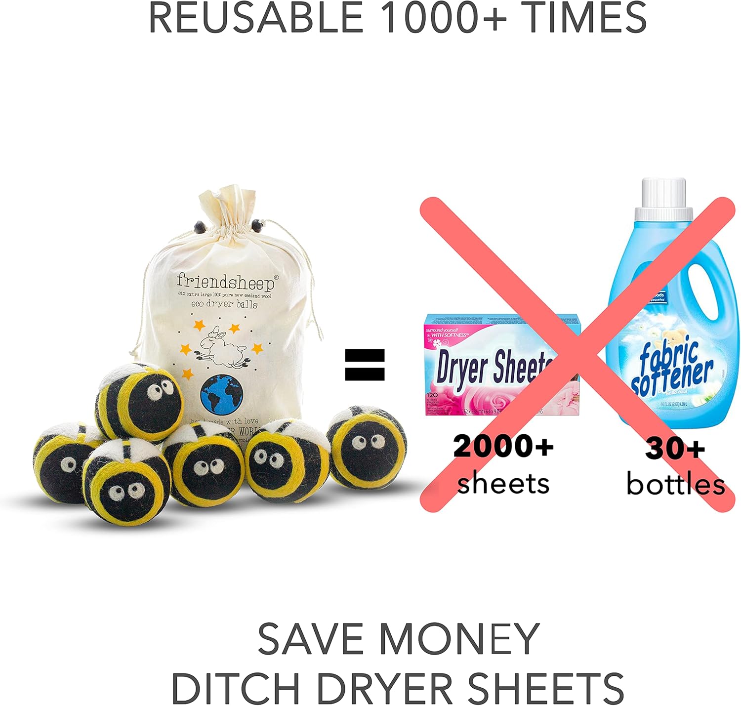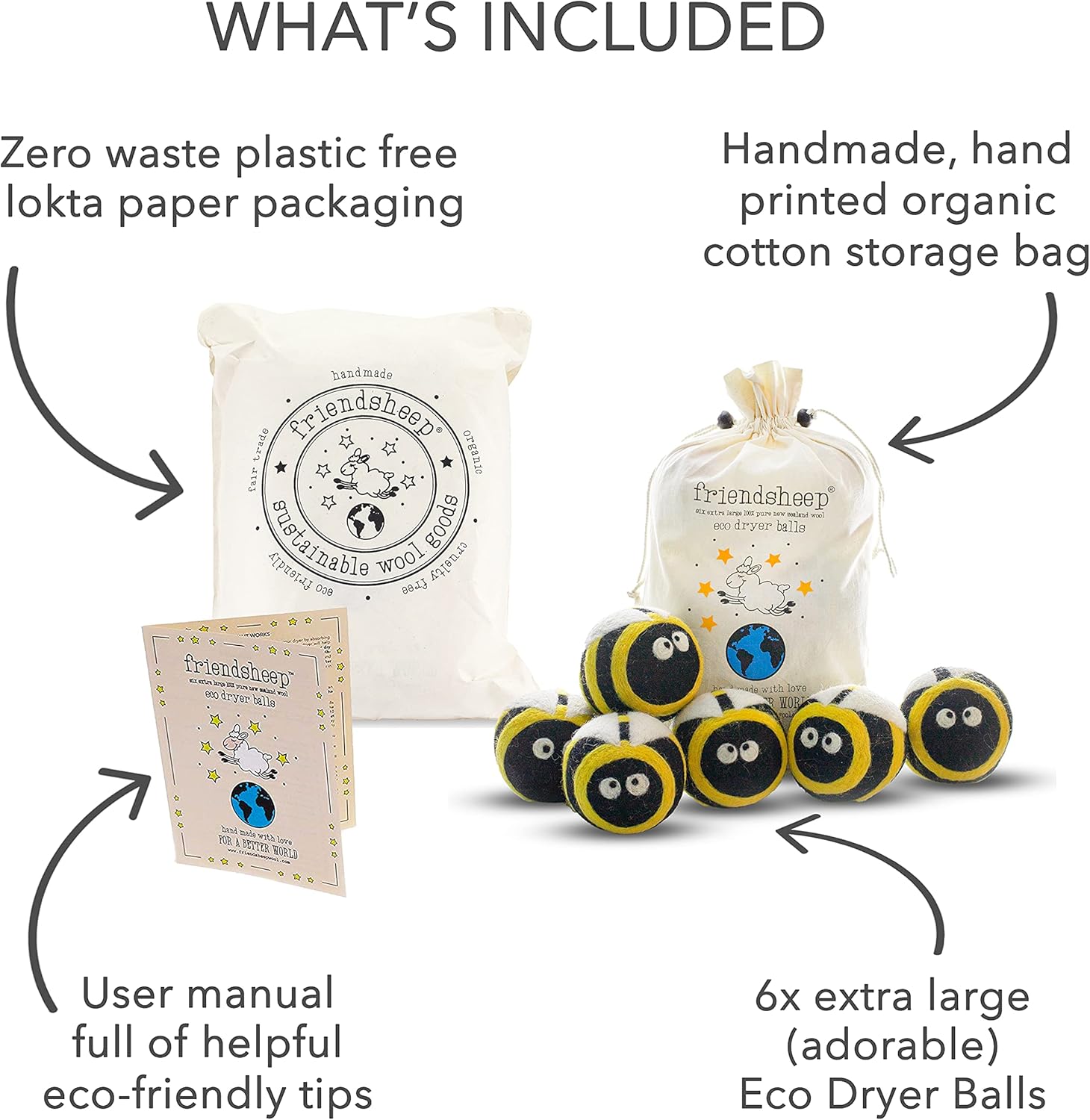 Friendsheep Wool Dryer Balls 6 Pack XL Organic Premium Reusable Cruelty Free Handmade Fair Trade No Lint Fabric Softener Honey Bee Bumblebee - Busy Bees