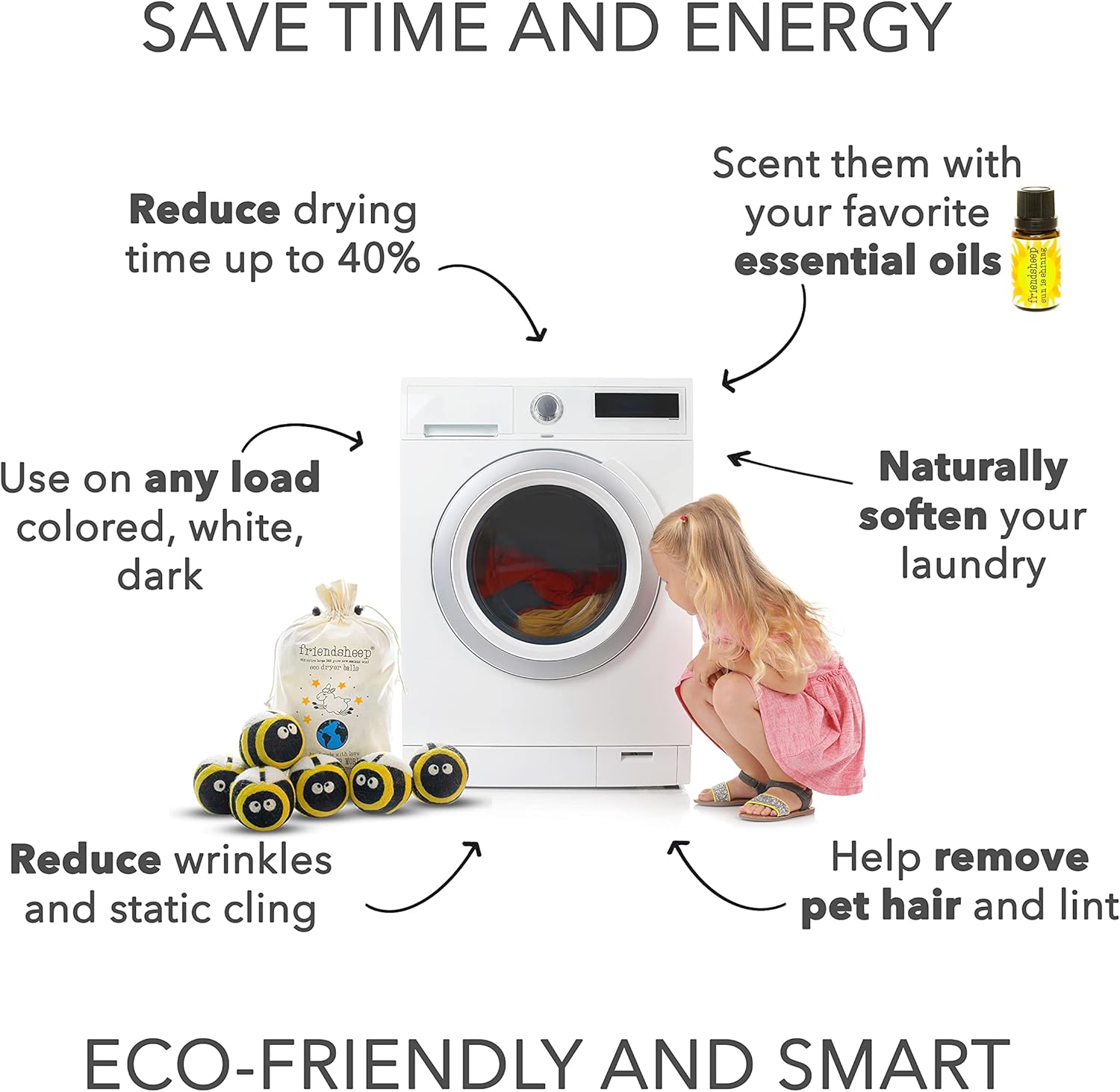 • ECO-FRIENDLY AND REUSABLE FOR 1000+ LOADS, replaces dryer sheets & liquid fabric softeners. Makes your laundry soft and fluffy, reduces wrinkles and static cling, and shortens drying time by up to 40% depending on load size. Your sheets and towels are fluffier, less balling and twisting. Makes you SAVE TIME, ENERGY, AND MONEY! All by keeping safe and healthy you, your family and the environment.