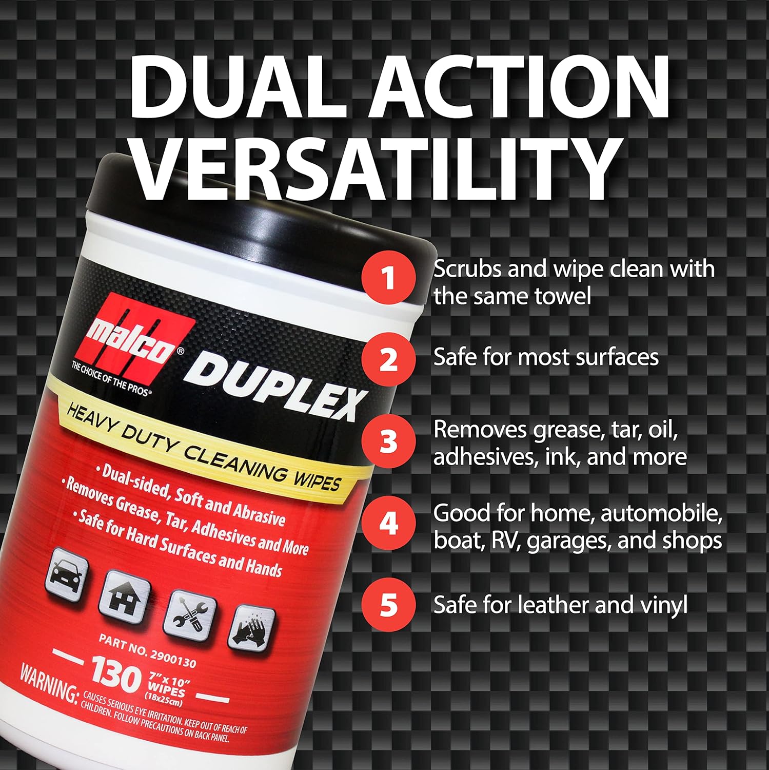 Malco Duplex Heavy Duty Cleaning Wipes for Home and Auto - Dual Sided Textured, Wet Wipe/Removes Grease, Tar, Paint, Oil, Dirt/No Residue/Safe for Hands/Made in USA (130 Wipes)