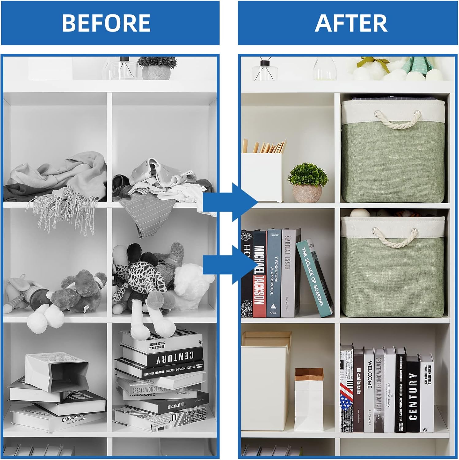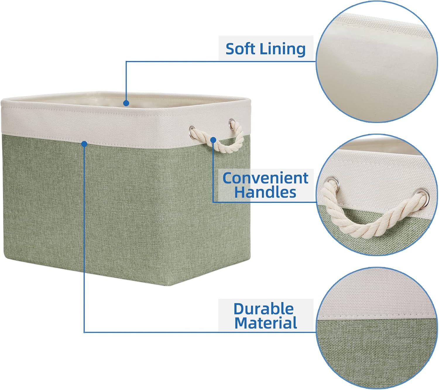 Temary Storage Baskets Fabric Storage Bins for Shelves, 2 Pack Decorative Storage Boxes Canvas Storage Basket with Handles for Organizing Clothes, Books(White&Green,16Lx12Wx12H Inches)