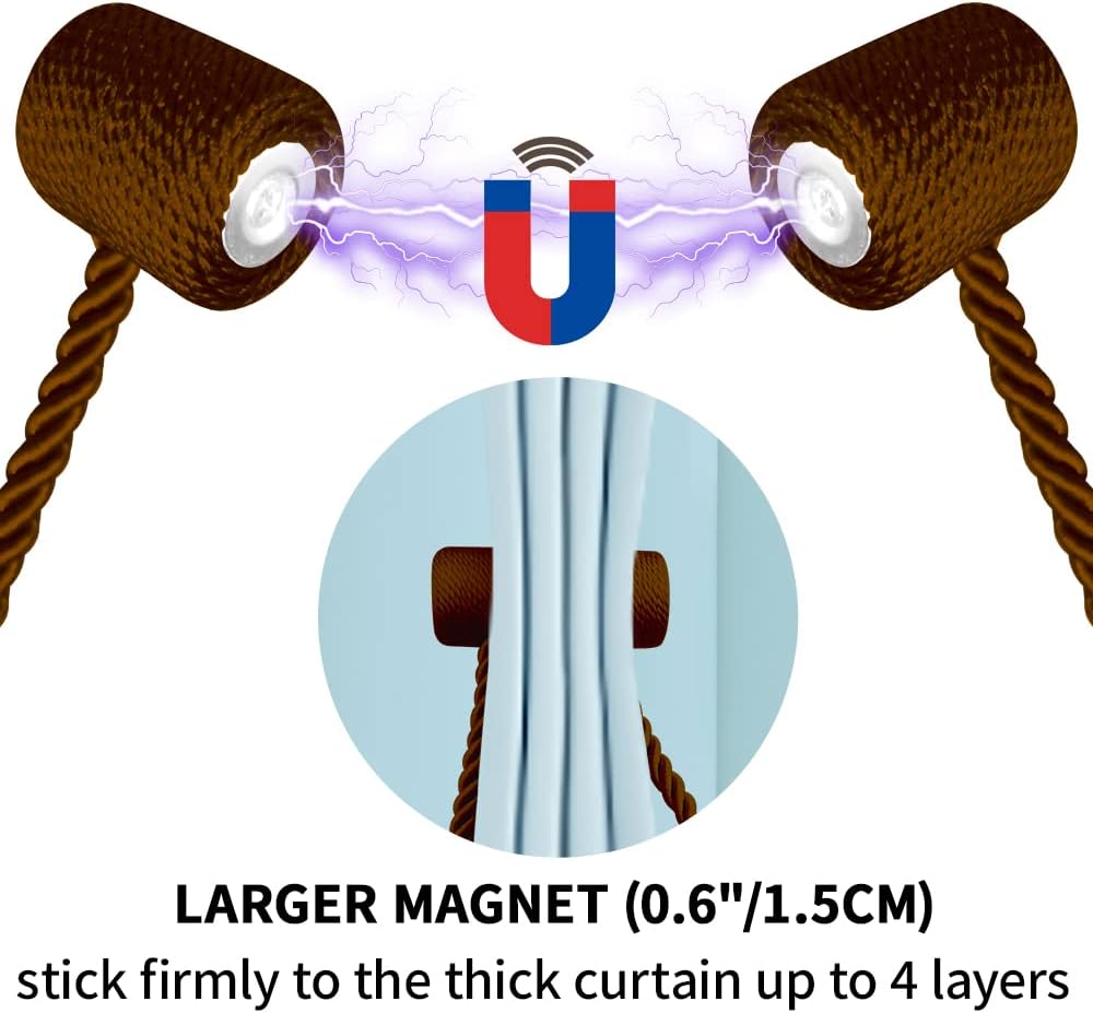 • NO DRILLING & INSTALLATION:The magnetic rope tie backs with modern upgraded stronge/durable magnets,hand-tiwsted woven texture apperance rope, heavy-duty polyester rope. No need any tools,no drilling your wall, so magnetic curtain tiebacks for drapes will not damage the wall easy to operate,hold your curtain in seconds. It is a perfect substitute for wall-mounted hooks and could be tied on anywhere, and you don’t need to worry about the extra curtain hooks hurting the child