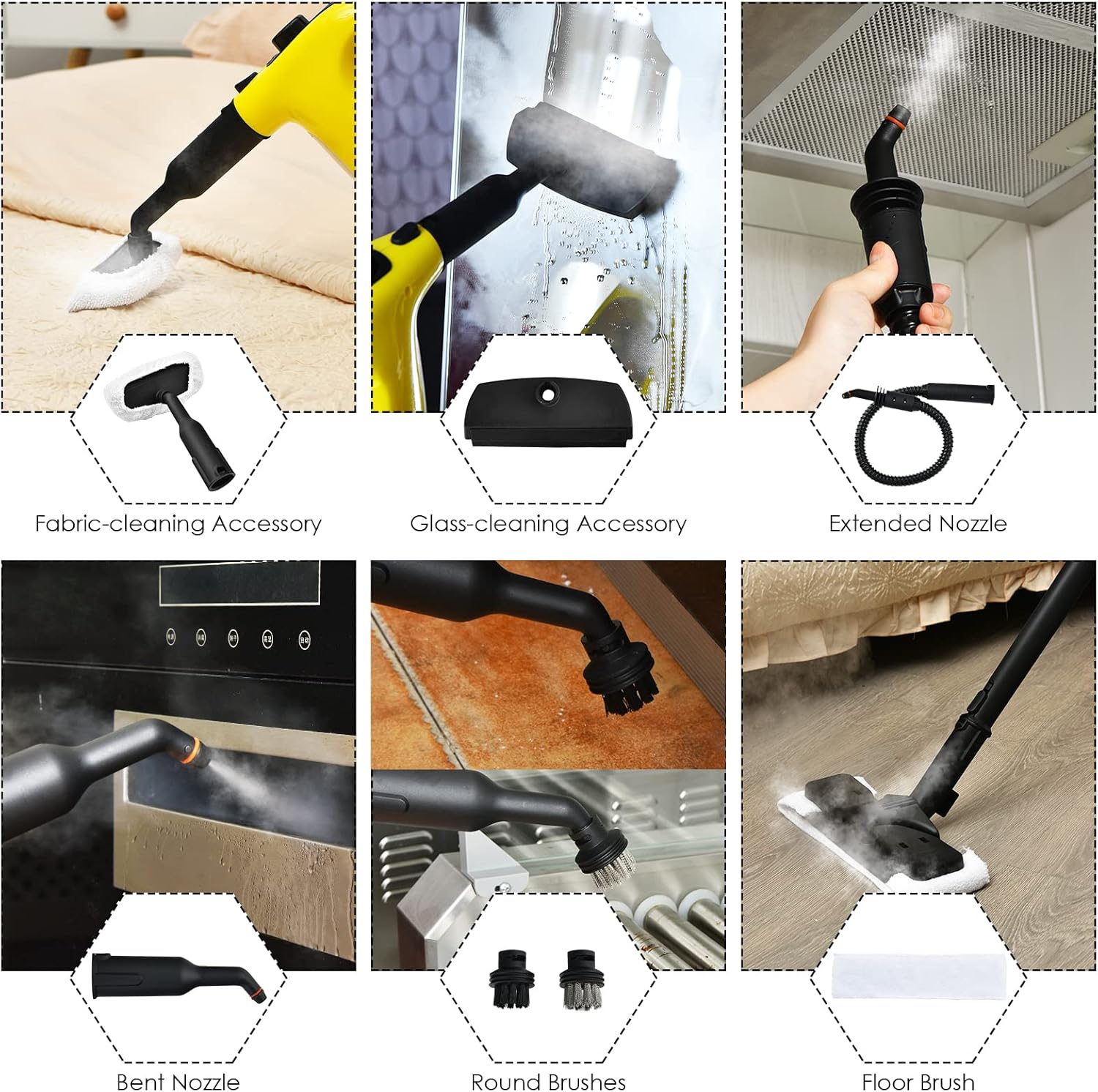 • 🏠【Complete Accessory Set】The steam cleaner comes with a complete set of cleaning accessories, including nylon brush, floor brush,big nozzle, funnels, measuring cups, etc.,to meet different cleaning needs. The handheld steamer is great for cars, mattresses, wallpapers, windows, stoves, countertop, sofas and other sealed surfaces such as ceramic, glass, marble, hardwood floors, etc.