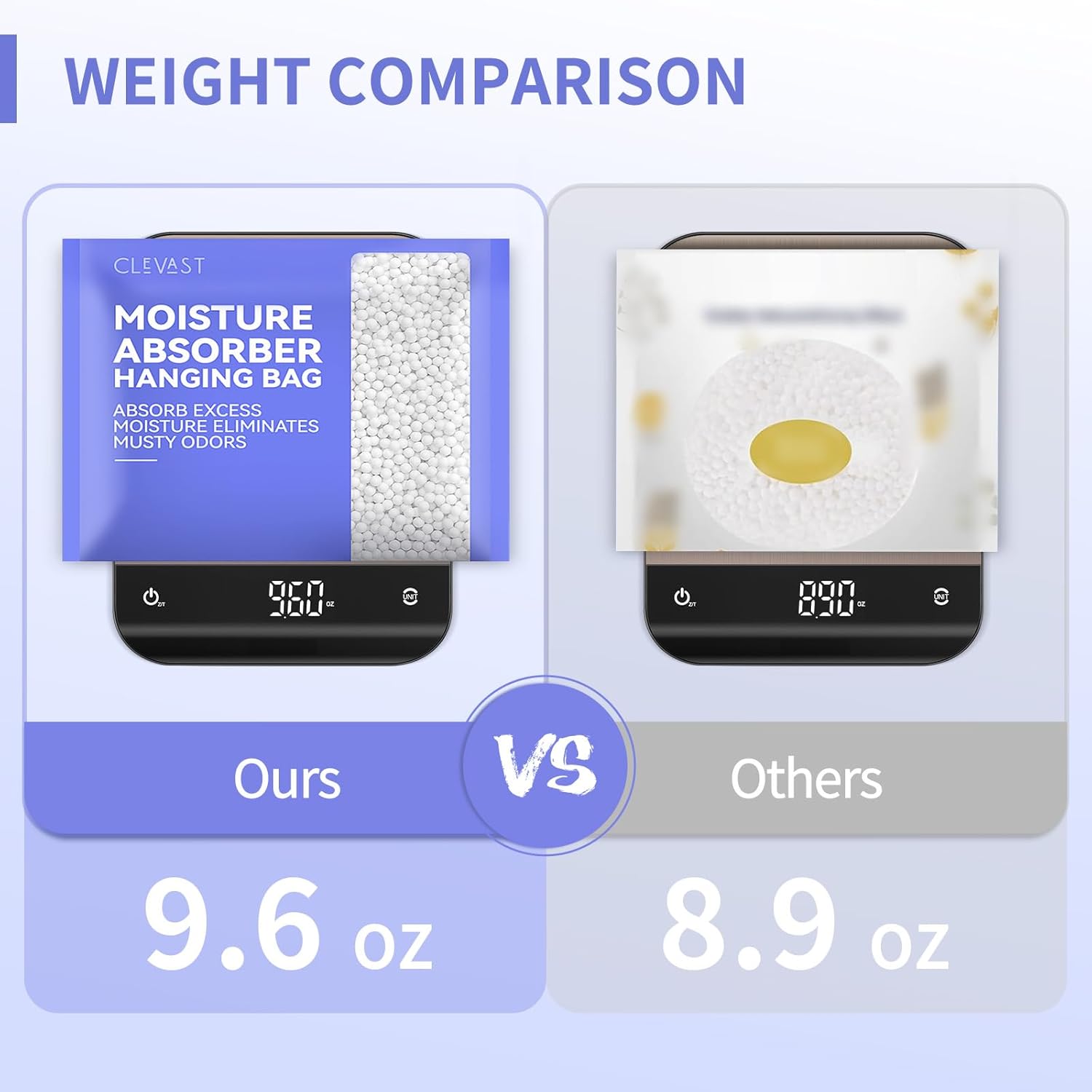 • EFFECTIVE DEHUMIDIFICATION: The CLEVAST dehumidifier bags feature spherical calcium chloride particles that can attract and absorb excess moisture quickly and efficiently. Moisture absorbers are designed with a premium one-way moisture-permeable paper that will securely lock the moisture inside.(WHEN the temperature drops sharply or the humidity is low, crystals may appear inside the bag, and no water droplets at the bottom. This is normal, please be patient for the product to work)