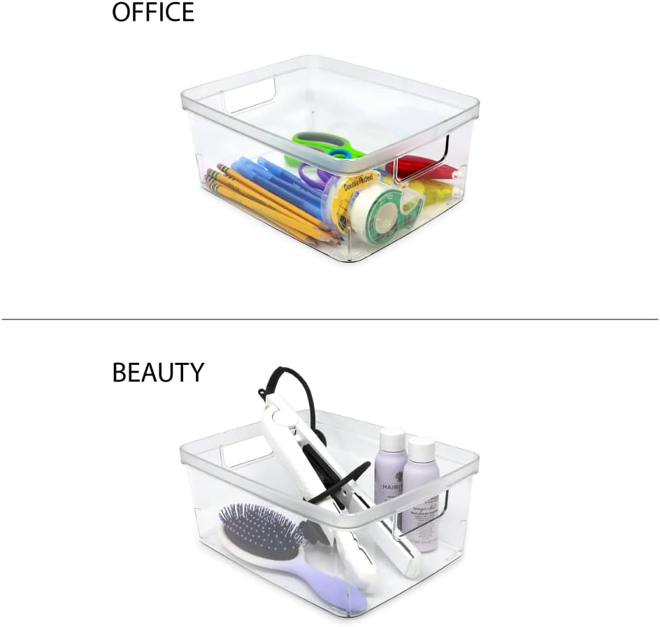 • CLEAR DESIGN: Staying organized is easy with these modern, clear plastic bins. The cutout handles make it easy to hold and carry. The clear design of each bin enables you to quickly see what’s stored in each container; ideal for when you’re on-the-go. These modern bins are designed to blend into the décor of any room while cleaning up the mess on your desk, counterspace and tabletops. [Dimensions of each bin: [8” L x 10” W x 4.25” H]