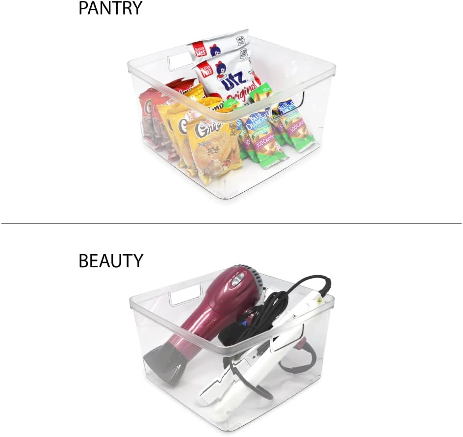 • CLEAR DESIGN: Staying organized is easy with these modern, clear plastic bins. The cutout handles make it easy to hold and carry from room to room. The transparent design of each bin enables you to quickly see what’s stored in each container; ideal for when you’re on-the-go. These modern bins are designed to blend into the décor of any room while cleaning up the mess on your desk, closet shelves, counterspace and tabletops. [Dimensions of each bin: [10” L x 10” W x 6.1” H]