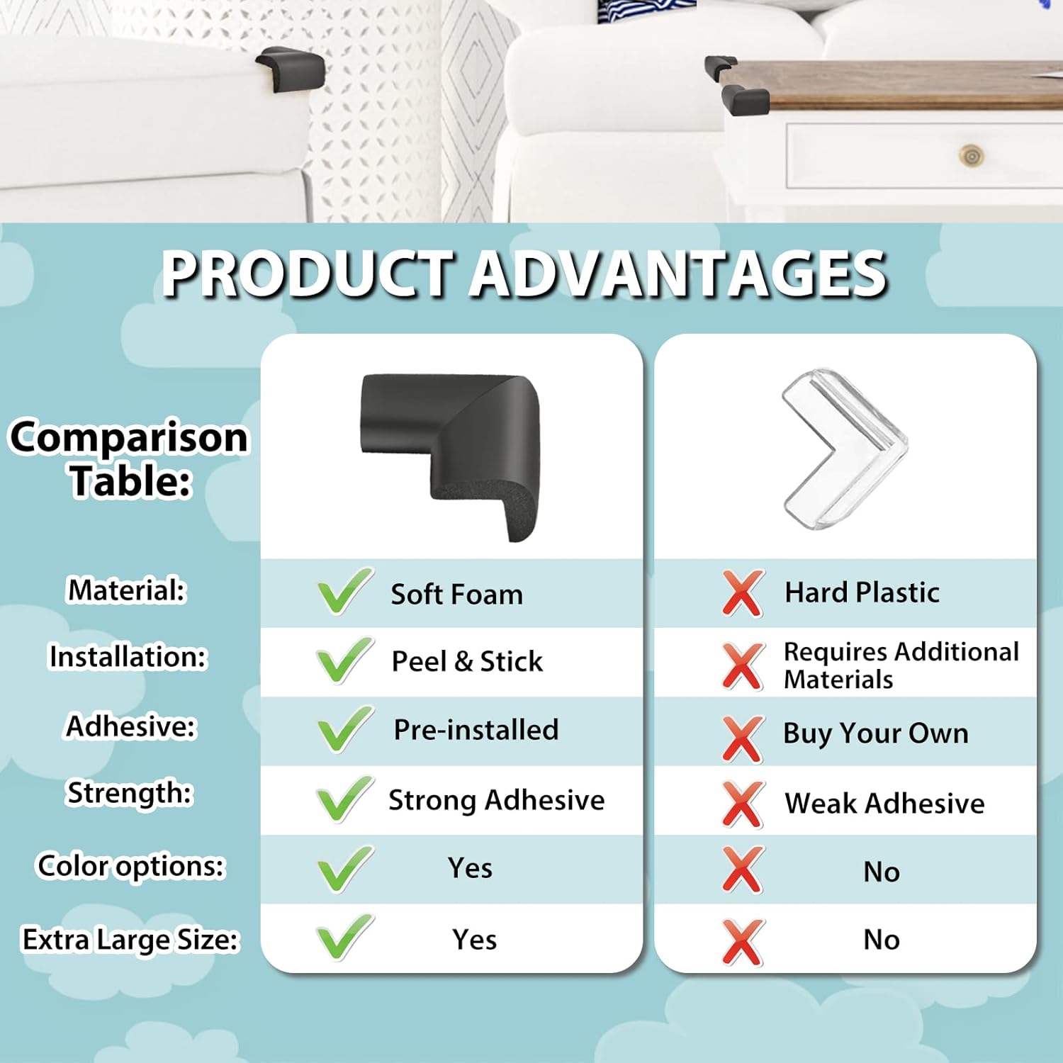 • Easy Installation: All of our baby proofing edge guards are pre-taped.You can just clean the corner of the furniture, tear off the tape, align it with the corner, then stick the edge guards and press it gently. The whole process will take you no more than one minute.