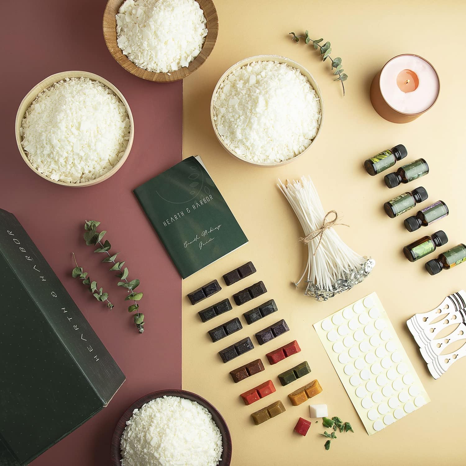 • All-In-One Starter Kit – Everything you need to dive into candle making! Our Hearth and Harbor soy candle wax for candle making includes 10 lb. bag wax, 16 dye blocks, 6 candle scents for candle making, 50 cotton candle wicks for candle making, 50 candle wick stickers, 4 wick holders. Perfect for beginners or seasoned DIYers.