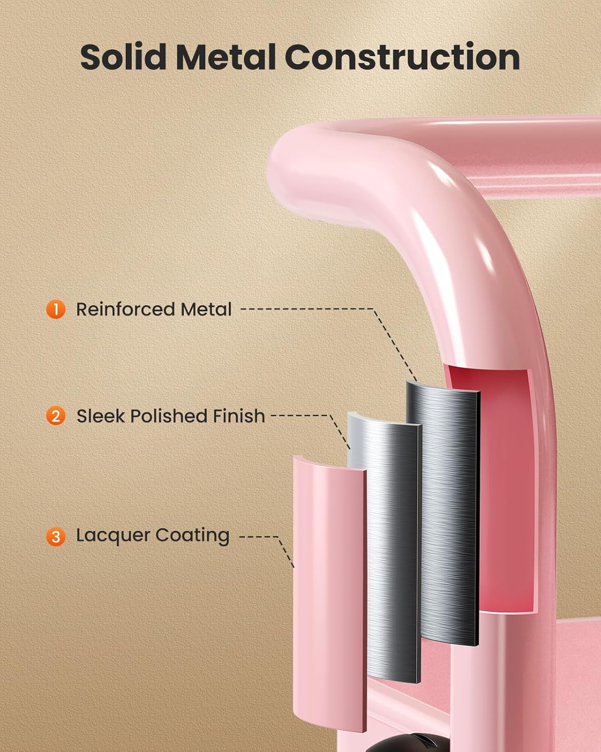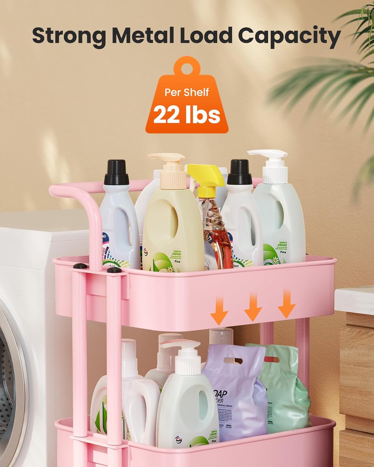 Pipishell 3 Tier Mesh Utility Cart, Rolling Metal Organization Cart with Handle and Lockable Wheels, Multifunctional Storage Shelves for Kitchen Living Room Office Pink