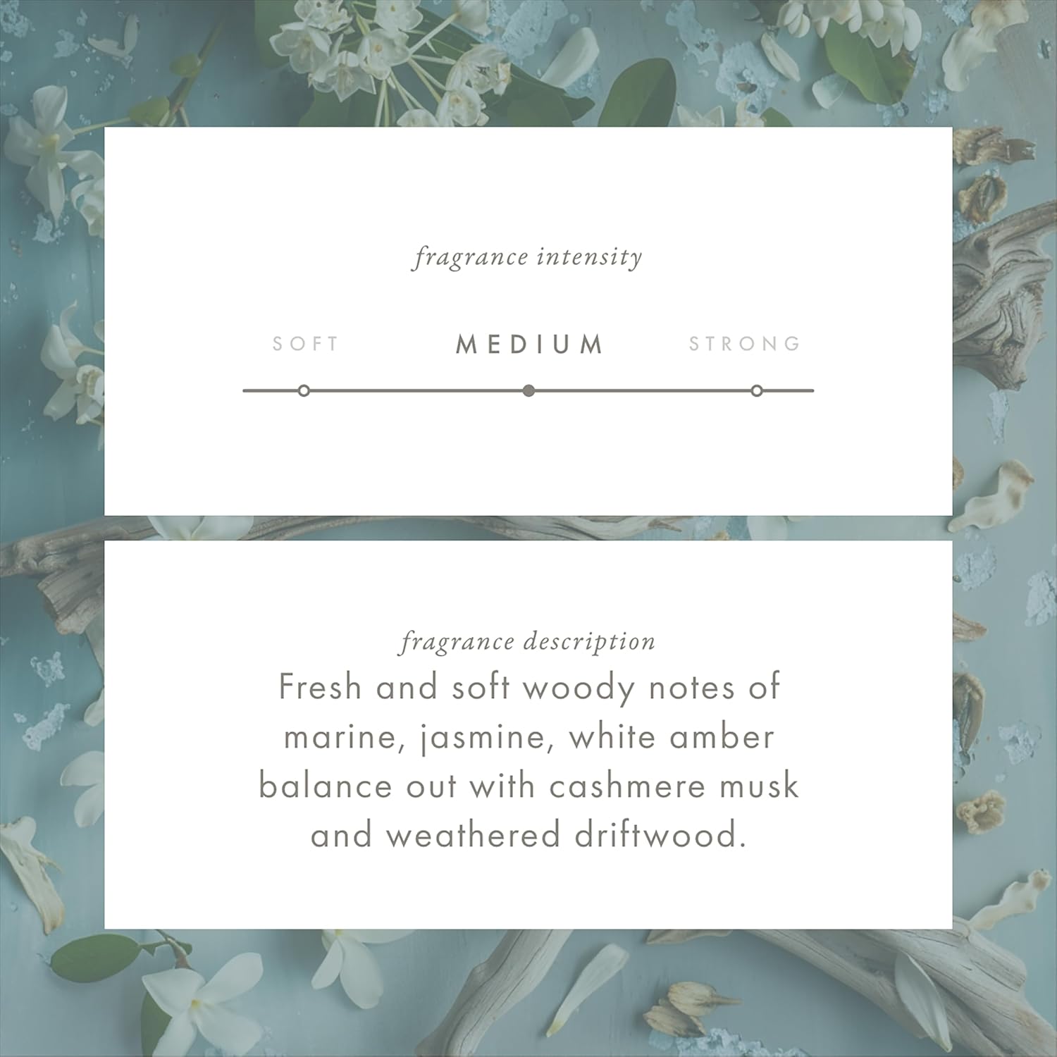 • WAKE WITH THE SUN AND AMBLE ALONG A PEBBLED COVE. Calm waves gently lap at the shore as refreshing seaside breezes bring notes of salted air mingled with faraway jasmine and white amber. Just as you glimpse a sense of longing for shores unknown, cozy notes of soft cashmere musk and weathered driftwood ground you in utter contentment and gratitude for the here and now.