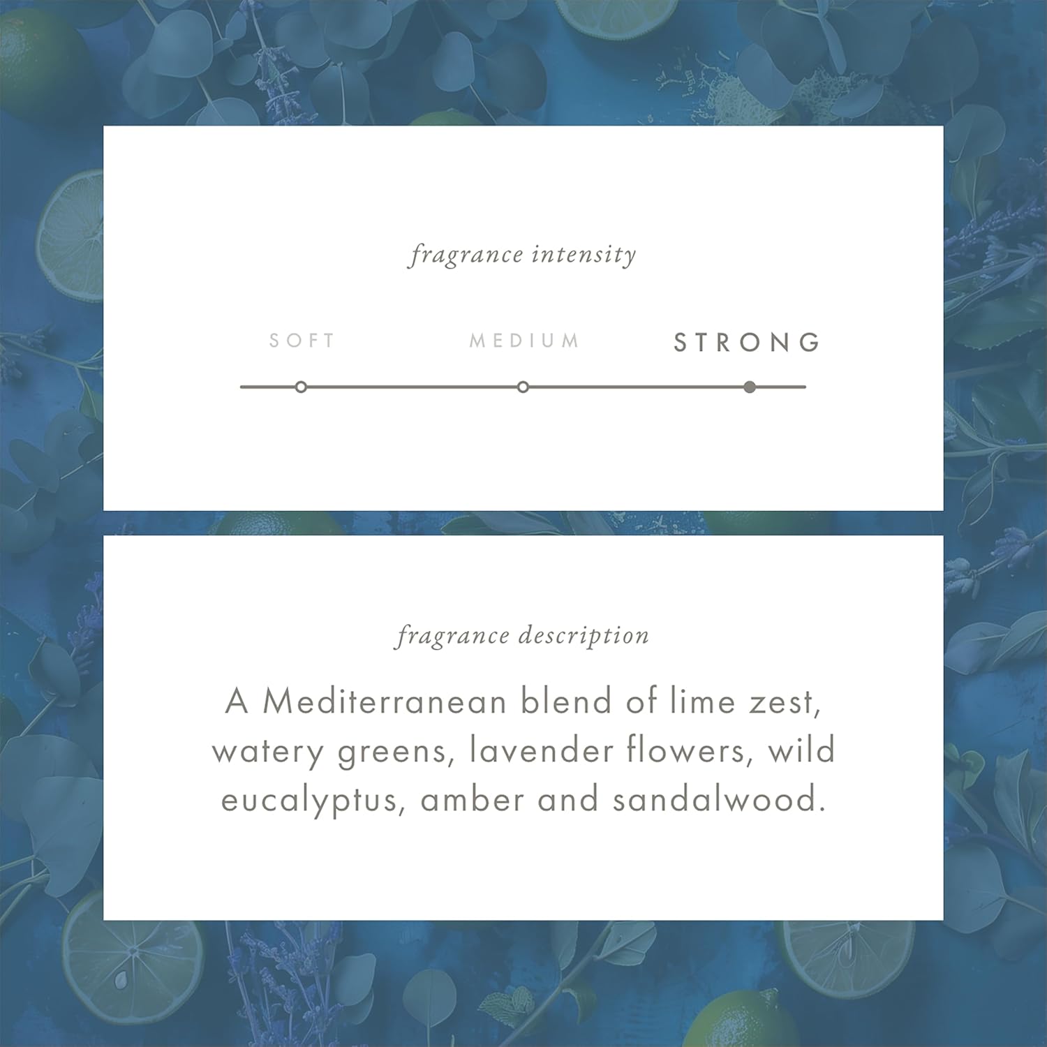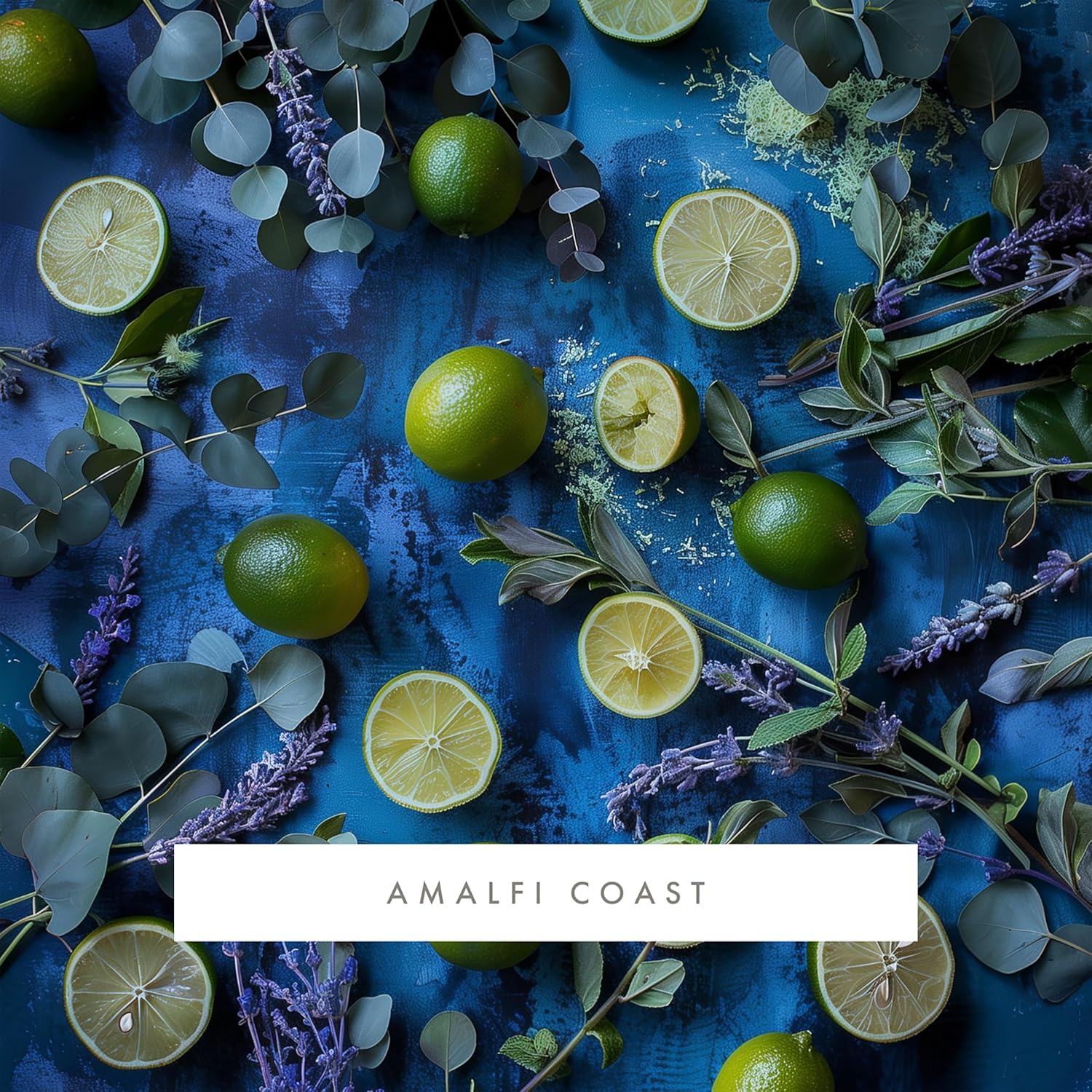 • CERULEAN SEAS HUG MEDITERRANEAN SHORES DOTTED WITH PASTEL HILLSIDE TOWNS. Here it’s always warm and sunny. Everything from the salty air to the sumptuous society is breezy and breathtaking. The scent of bright lime and watery greens mingle with sweet, herbal lavender, refreshing eucalyptus, and the woodsy perfume of sandalwood. Breathe in the allure of the Amalfi Coast—you may never want to leave.