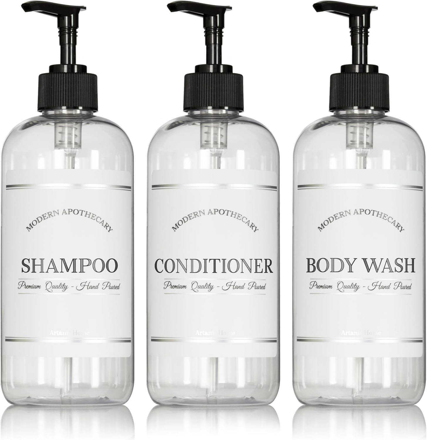 • Bring Style To Your Bathroom: Revel in the luxury of a well-organized shower. Refine your interior decor with these chic body wash, conditioner and shampoo dispenser bottles. Curate your whole home. Modern Apothecary bathroom bottles coordinate with additional matching titles for the sink, kitchen, office, and rentals. Classy, with a touch of retro flair