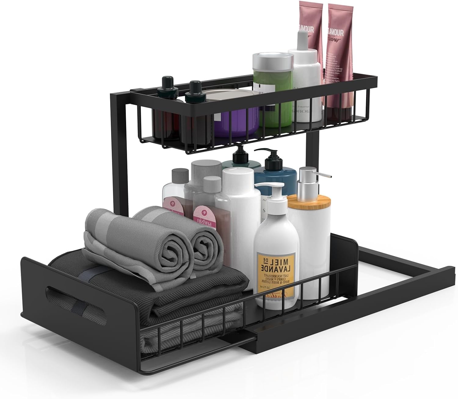 • [Space Saving] Organize the space under your cabinets with this 2-tier under sink storage. This under the sink organizer can solve your under cabinet storage troubles and increase the utilization of limited sink space. With pull out cabinet organizer, you have room for all your stuff, and a slide-out system like this makes it easier to access everything you store under the sink