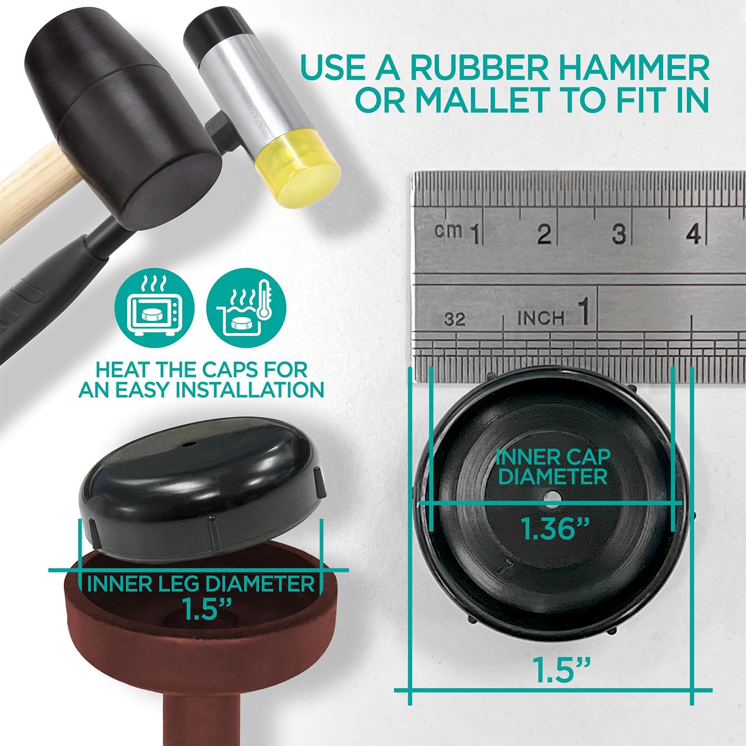 • A Breeze To Install - These round caps are meant to fit snugly onto chair legs with an inner diameter of 1.5”. Simply pop them into your furniture’s feet and hit using a rubber hammer or a mallet.