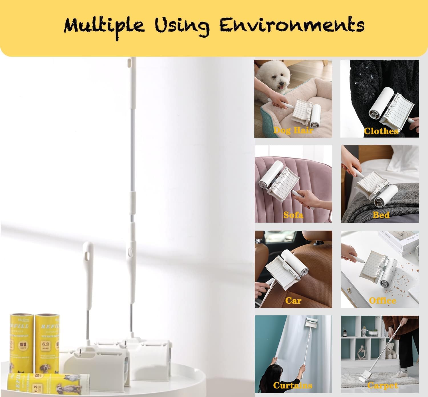 • 🏆 LARGE SURFACE, CLEAN MORE QUICKLY AND EFFICIENTLY: Large surface lint roller will serve as a perfect assistant in your home, office and car. Supersize 6.3'' lint roller with Easy Flip Cover consists of 4 Refills, total 240 sticky Sheets. It is extremely easy and effective for all surfaces; clothes, furniture, sofa, carpet, bed, curtains, hardwood floor etc. This large lint roller can remove cat/dog hair, lint crumbs, food debris, dust, glass slag and so on.