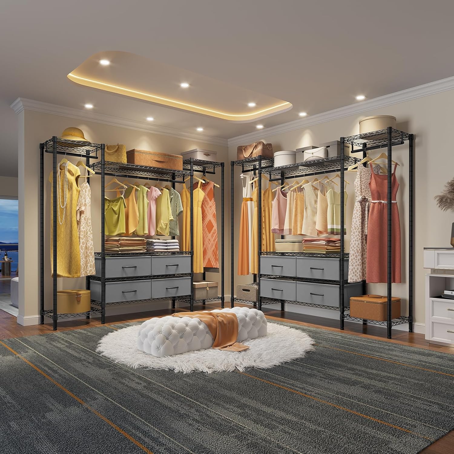 • All-in-one Multifunction Closet Rack: 6 Tiers Garment Rack V20 with compact design offers you various storage area to place your clothes, accessories, shoes, etc. It features 6 height adjustable shelves for extra storage capacity, 3 detachable hanging bars that easily accommodates to the length and size of your garments and 4 fabric drawers with wooden handles which makes it easy to grab and pull from shelves.