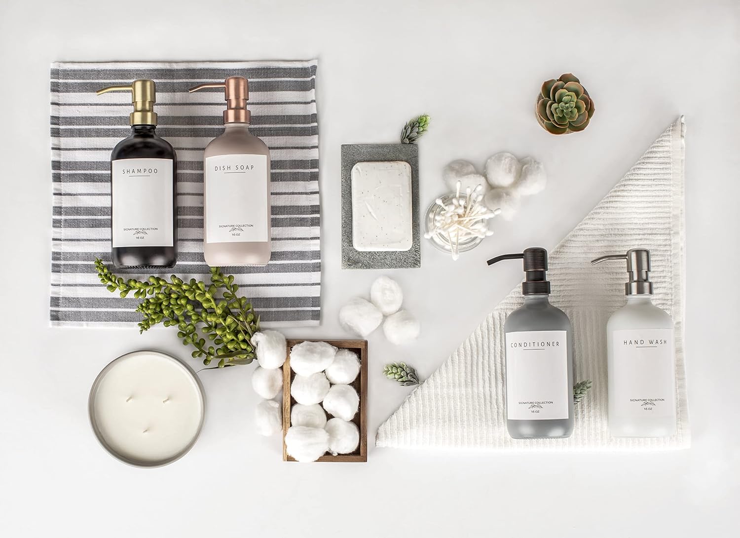 • ✅ 5 WATERPROOF LABELS: Now with 5 stickers, it's your choice to use the Kitchen Soap Dispenser Set with Dish Soap for hand soap, dish wash, lotion, conditioner, or shampoo. To clean the lotion dispenser set for the bathroom and kitchen sink soap dispenser set, just run the bottle under water and watch any residue simply wash off. With our exclusive no-leak pump, the bottle enables you to put out a good amount of soap with a single pump.