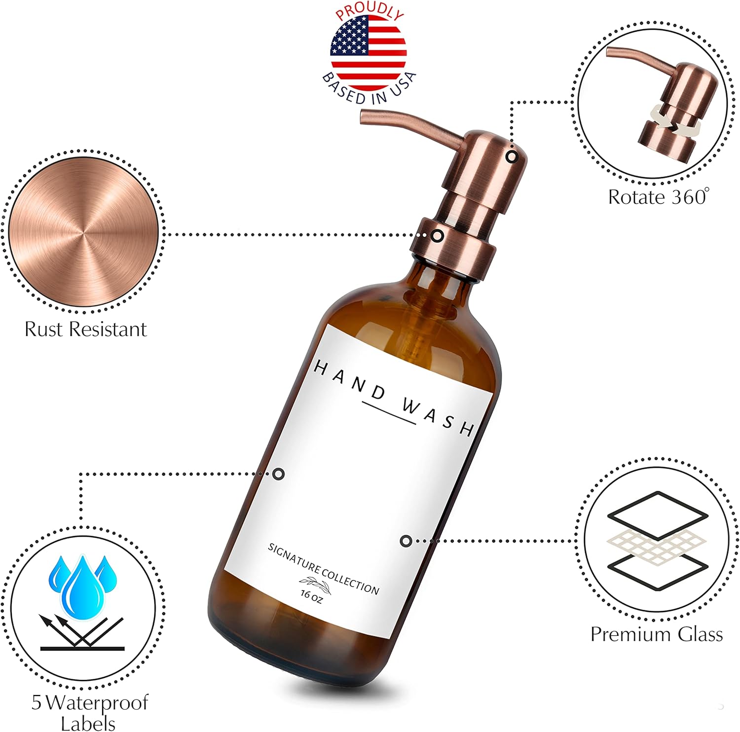 • ✅ 2-in-1 COMBO: Upgrade your home with our glass soap dispenser set. The dish soap dispensers are crafted from the highest quality glass and can be used as soap dispensers for kitchen sinks, soap dispensers for bathrooms, or as hand soap dispenser of your favorite liquid. The kitchen soap dispensers come with 2 dish soap dispensers for kitchen bottles (16 ounces), 2 stainless steel pumps, and 5 waterproof labels. Our selection includes colors including amber, clear, white, and black.