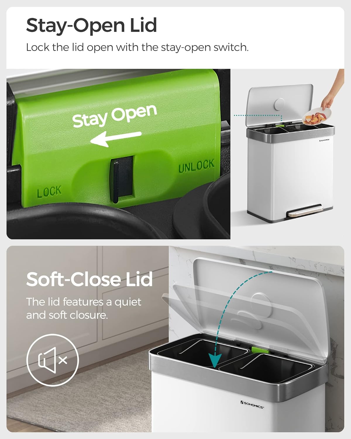 • [Easy Cleaning & Modern Design] The stainless steel recycle bin with a powder coating resists rust, which is also easy to clean; the cloud white finish complements the silver sheen for a modern look that fits any kitchen decor