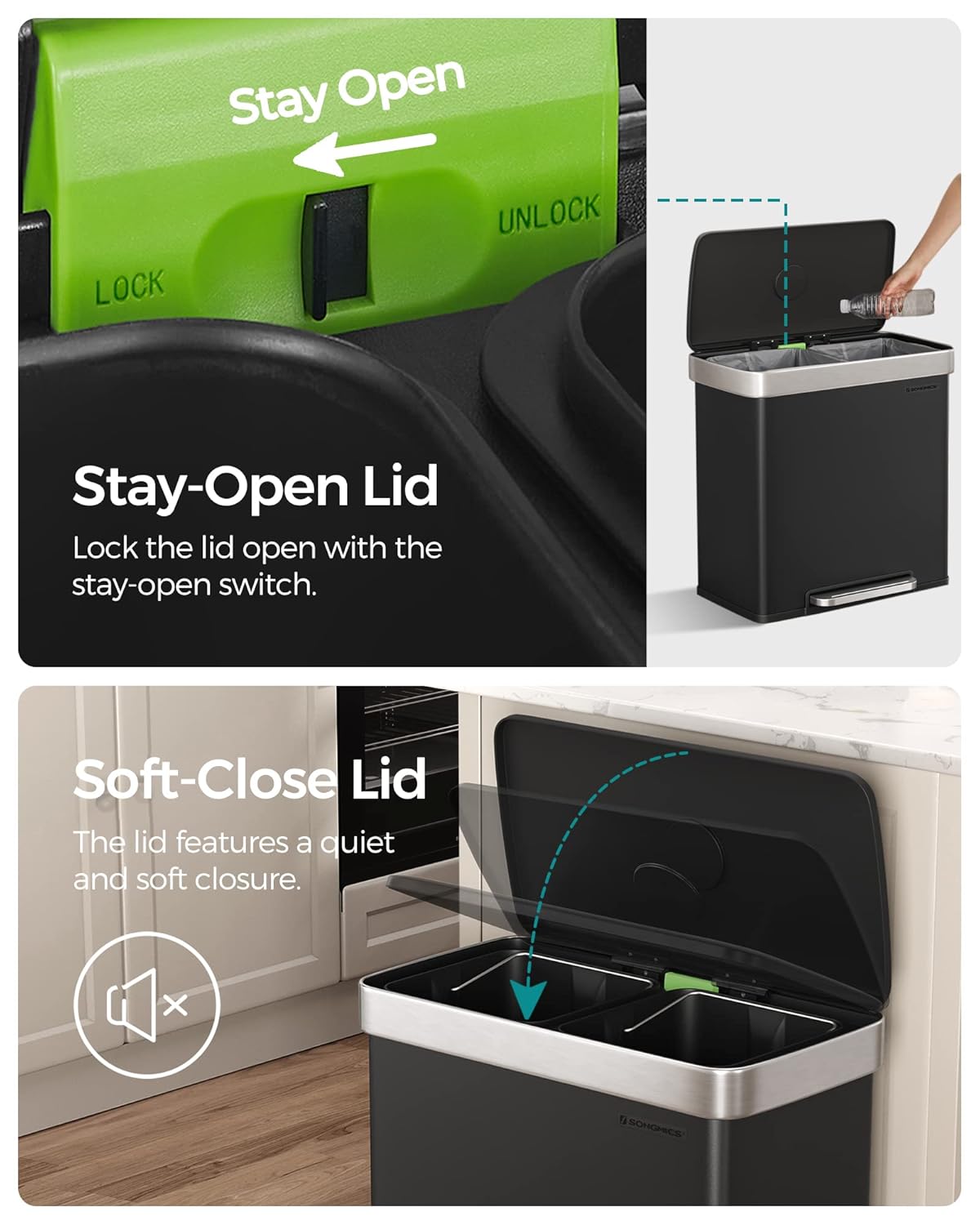 • [Dual Compartments & Liners] With two 8-gallon compartments, this dual trash can helps sort normal waste and recyclables in your kitchen; it comes with 15 custom-fit SONGMICS trash bags (code 30A), which are designed to perfectly fit this garbage can