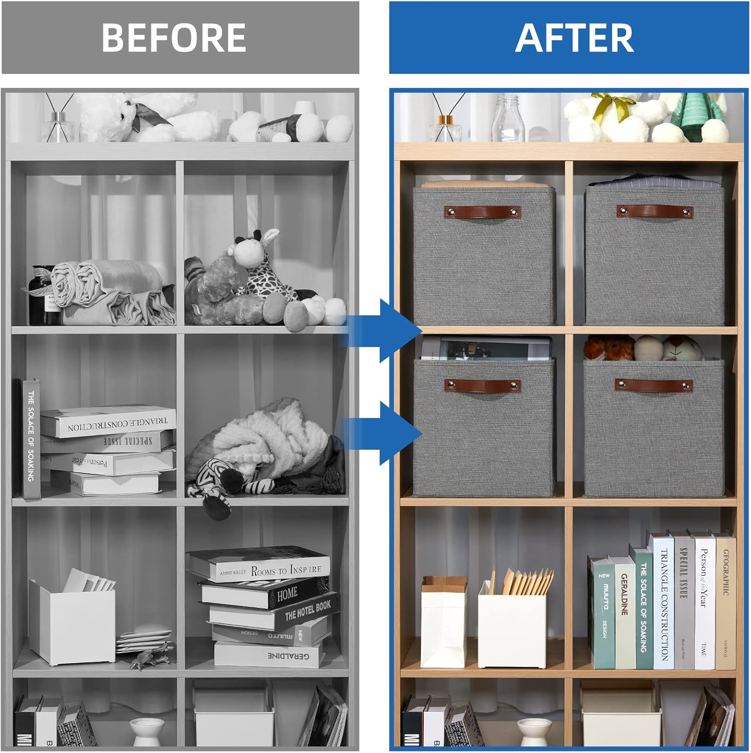 • CUBE BIN SIZE: 11 (L) x 11 (W) x 11 (H) inches, 4-PACK. Perfect 11 inch storage cubes for gifts empty, decorative storage bins for organizer. This cube storage baskets allowing to store a variety of items. Sturdy grey cube storage bins may be used to hold clothes, towels, blankets, bedsheet, DVDs, magazines, books, shoes