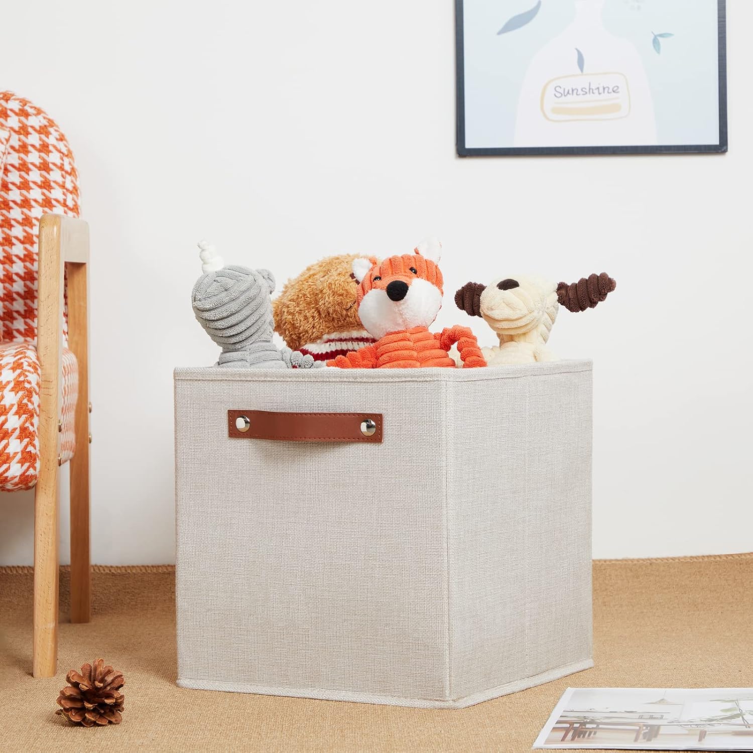• 【Sturdy Leather Handles 】Sturdy thickened leather handles and metal iron buckles make them easy to carry even with a heavy load. Cardboard is inserted at the bottom and sides to provide support, so that these decorative cube storage cubes bin to stand on, holding the shape well and can be used for a long time