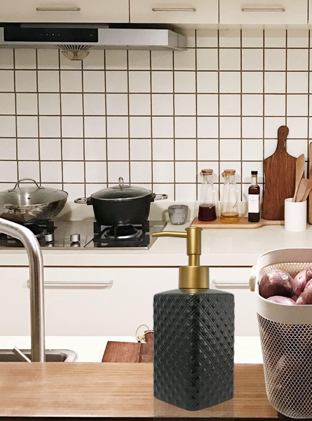 Gold Soap Dispenser for Bathroom,Black Square Lotion Dispenser, Refillable Countertop Ceramic Hand Soap Dispenser,Dish Soap Dispenser for Kitchen 350ml(Black Square Bottle)