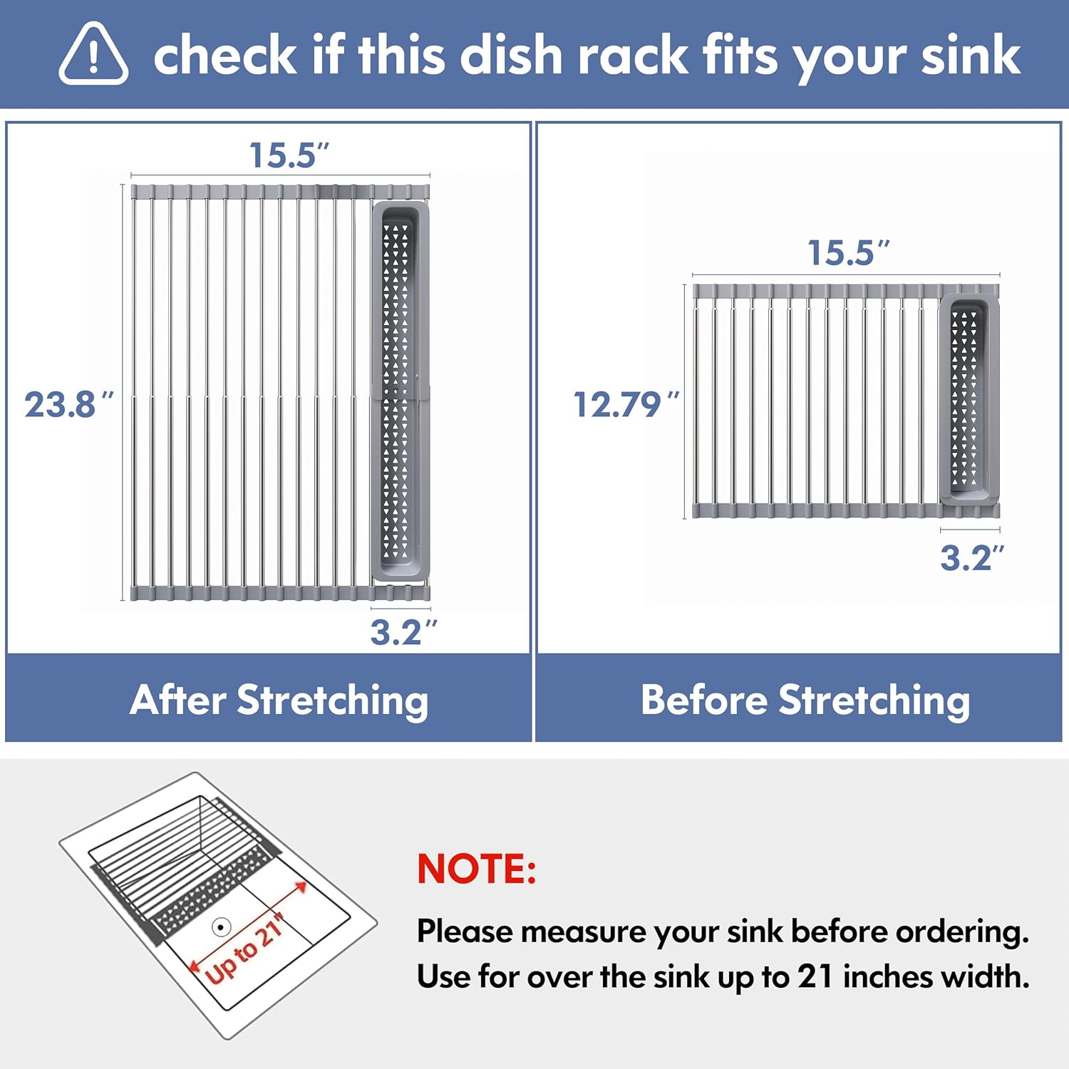 • Promise Me Measure Your Sink Size Before Purchase: Its size is x 12.8 - 23.8(D) x 15.5(W) inches, if your sink is wider than 21", this over sink dish rack may not be right for you. NOTE: Before using, please expandable the length of dish rack to fit your sink
