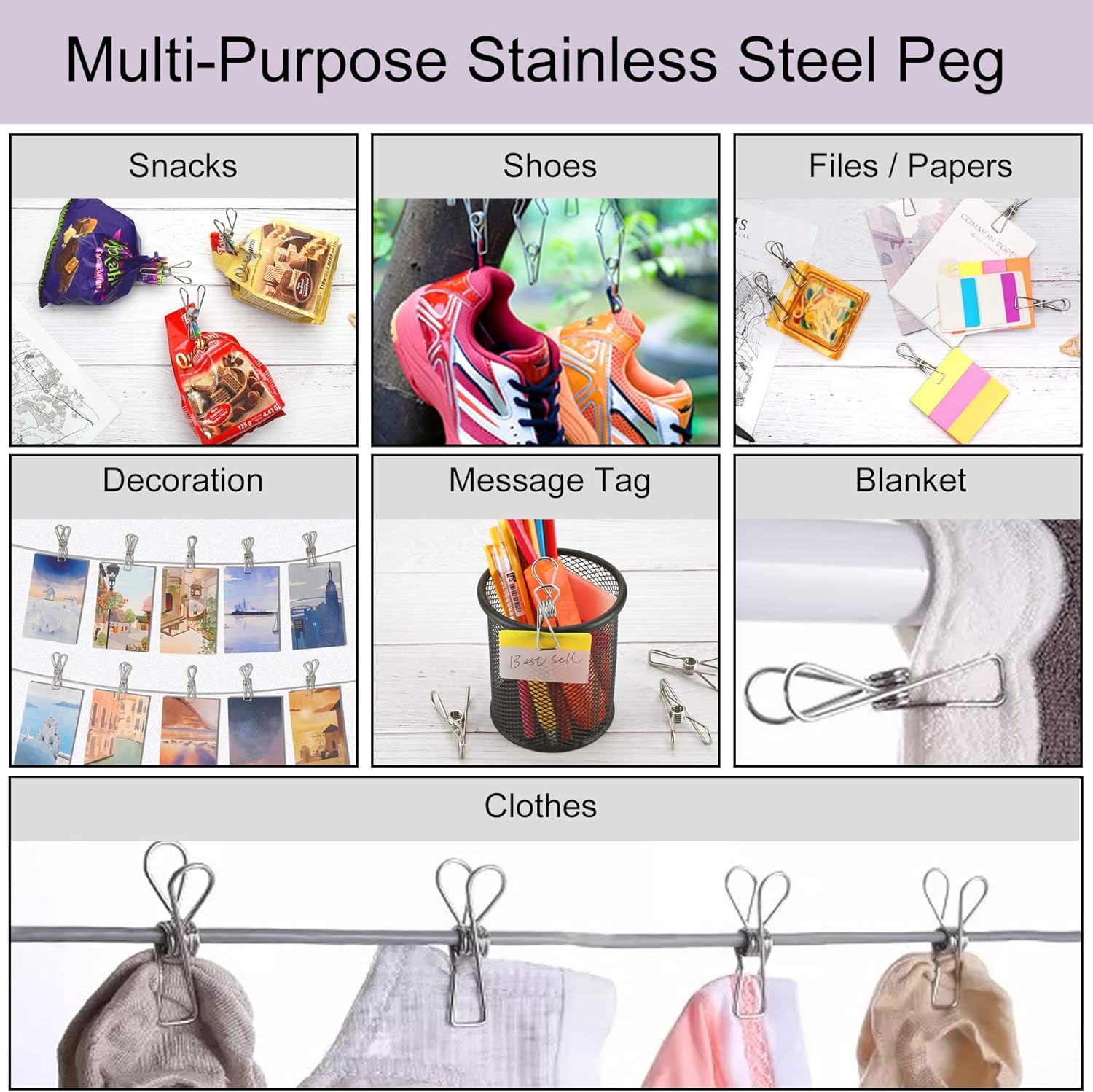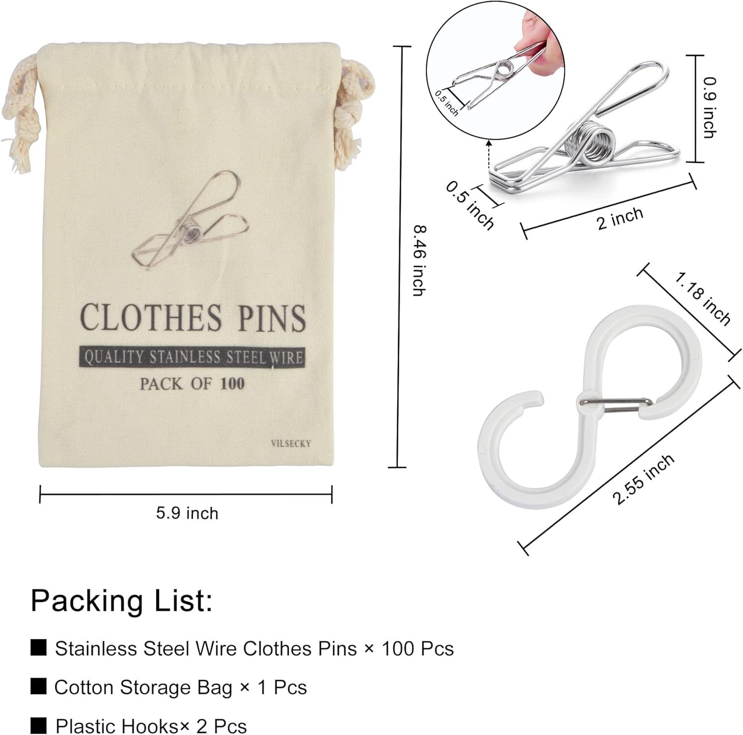• Package Included : Our clothespins set comes with 100 Pcs stainless steel wire clips,appro size:2" x 0.5" x 0.9" (L x W x H),1 Pcs well-made cotton clothespins storage bag with drawstring,appro size: 8.46" x 5.9" (L x W),2 Pcs plastic hooks,appro size: 2.55" x 1.18" (L x W).The accessories-hanging storage bag and hooks will help to organize the clothes pins well and locate them where you need.