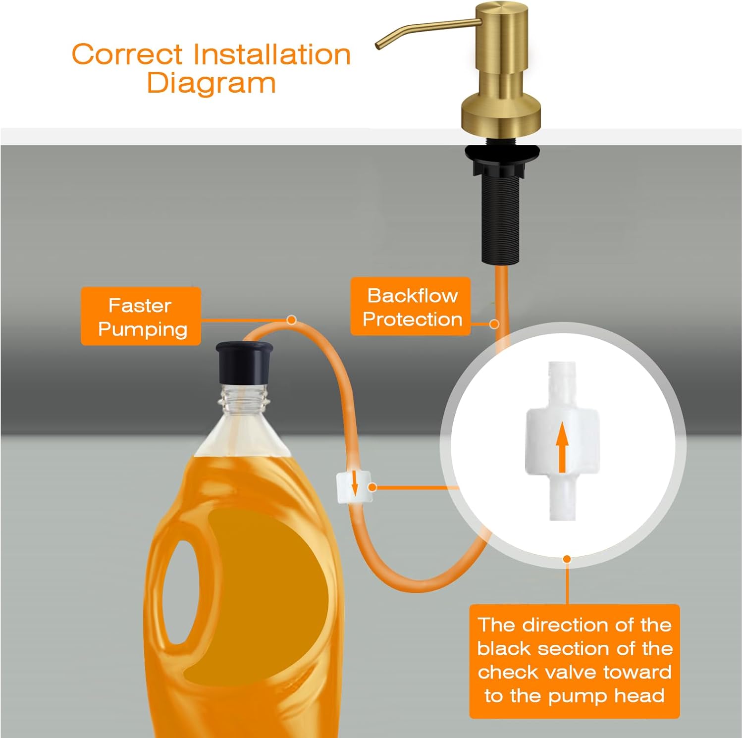 • Premium Quality & Durable: The kitchen sink soap dispenser is made of 304 stainless steel and premium quality PE plastic. Multi-layered brushed nickel finish makes it rust proof, so it has higher durability and reliability. Food-Grade silicone tube is soft and elastic, not easy to bend under the countertop, the check valve make the soap prime in the tube.
