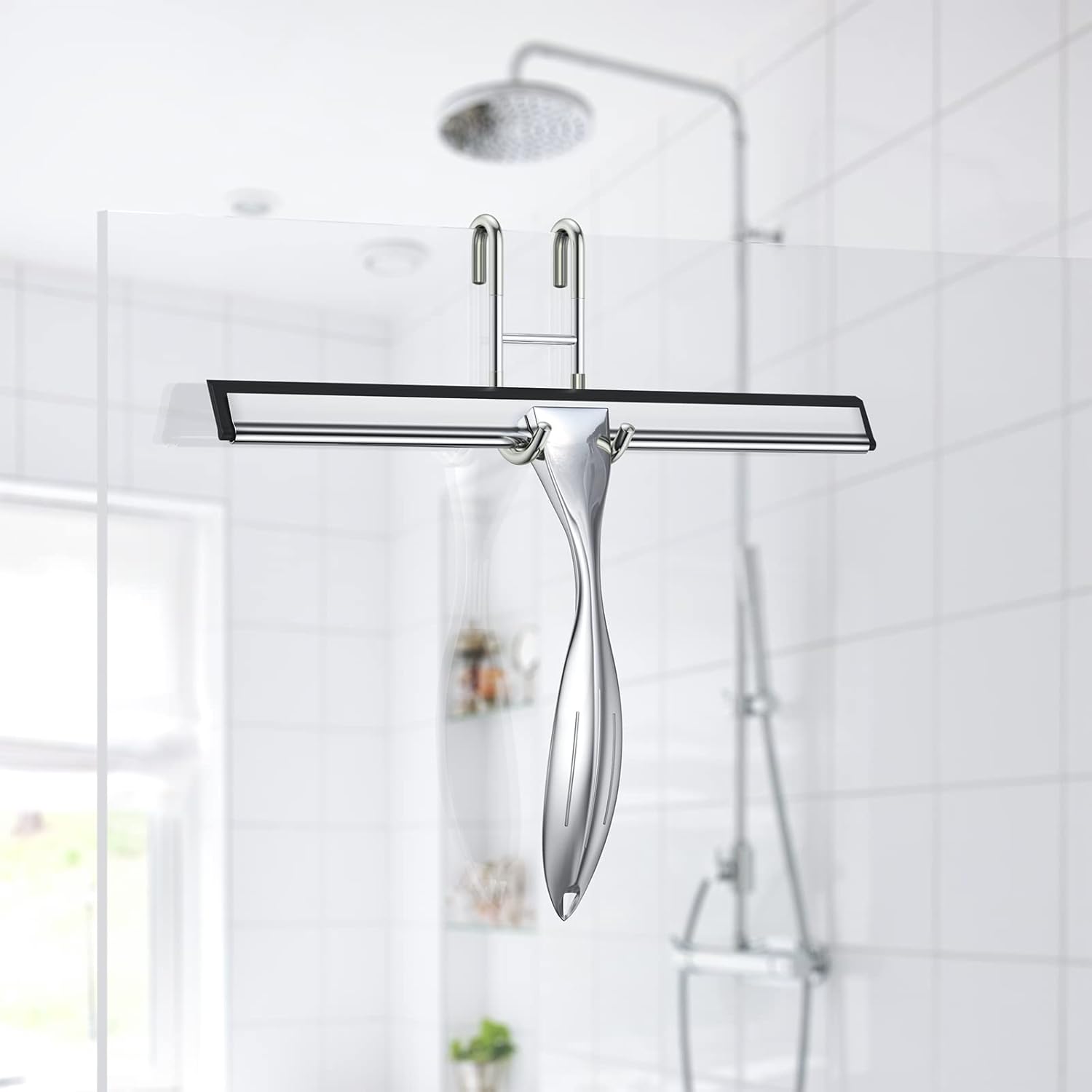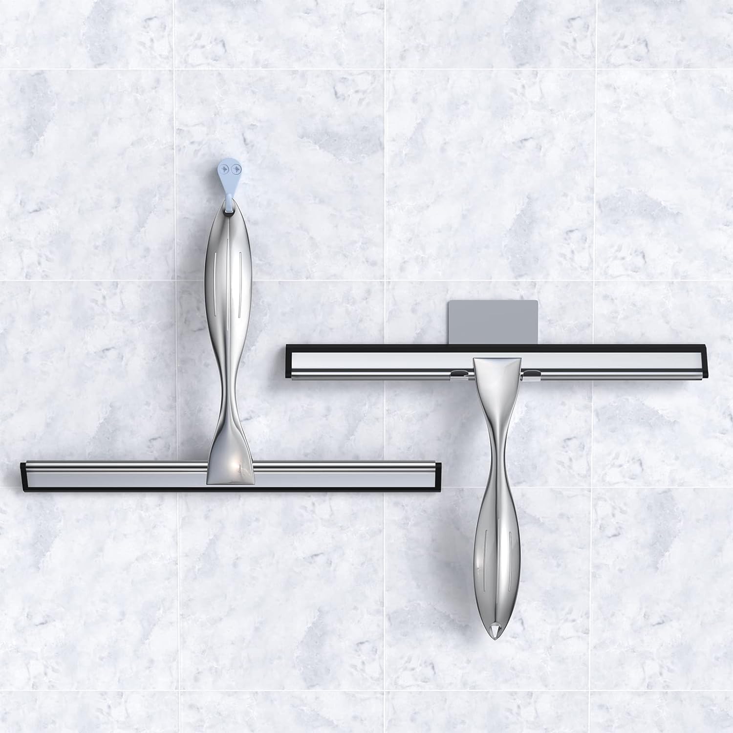 14-Inches Stainless Steel Shower Squeegee Set, Include Shower Door Hook, Adhesive Hook and Spare Silicone Blade, Window Squeegee for Shower Glass Door, Bathroom, Mirror, Window and Car Glass
