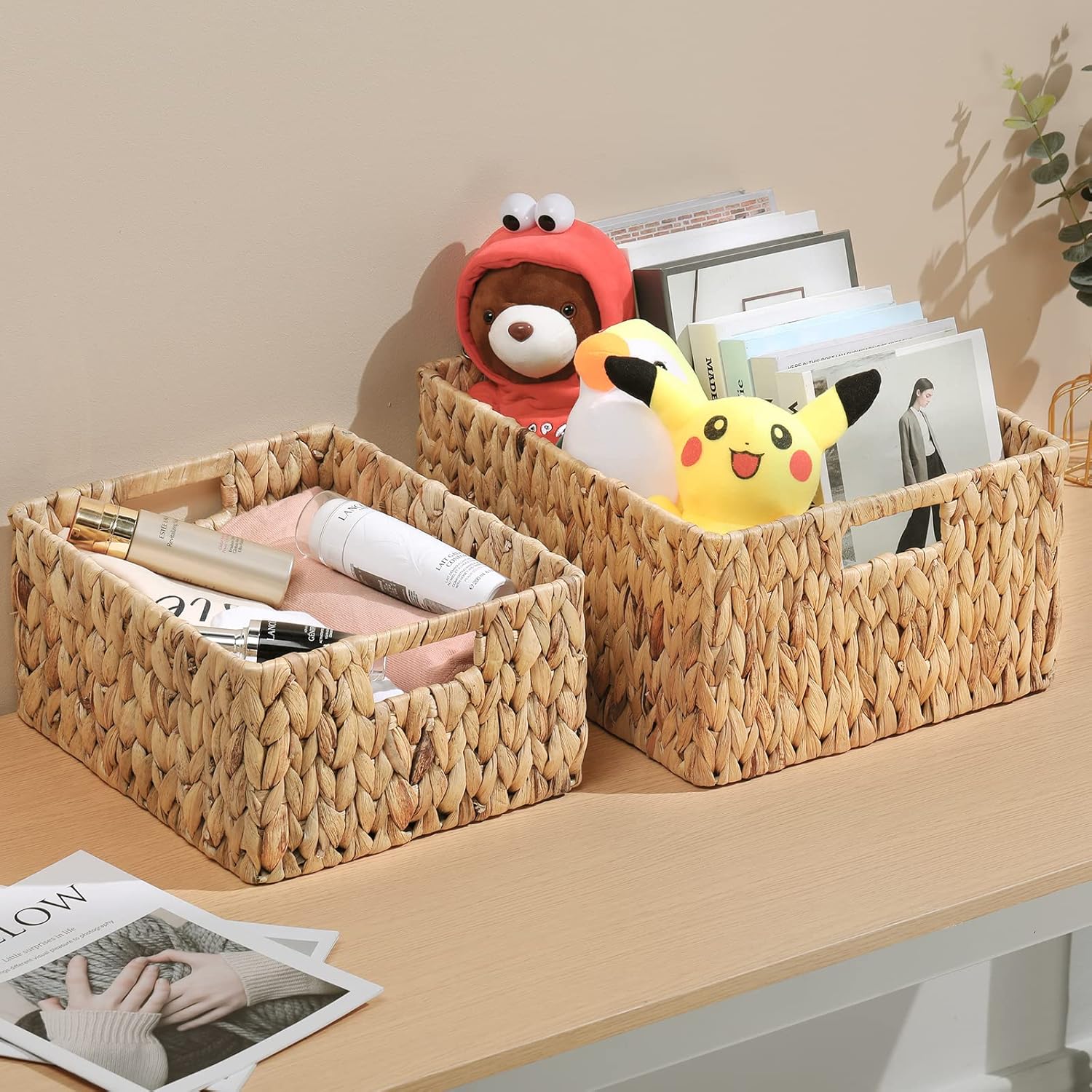 • Natural and Sustainable: these storage baskets for shelves are made of natural water hyacinth in a woven pattern, the material is natural and friendly to the environment.