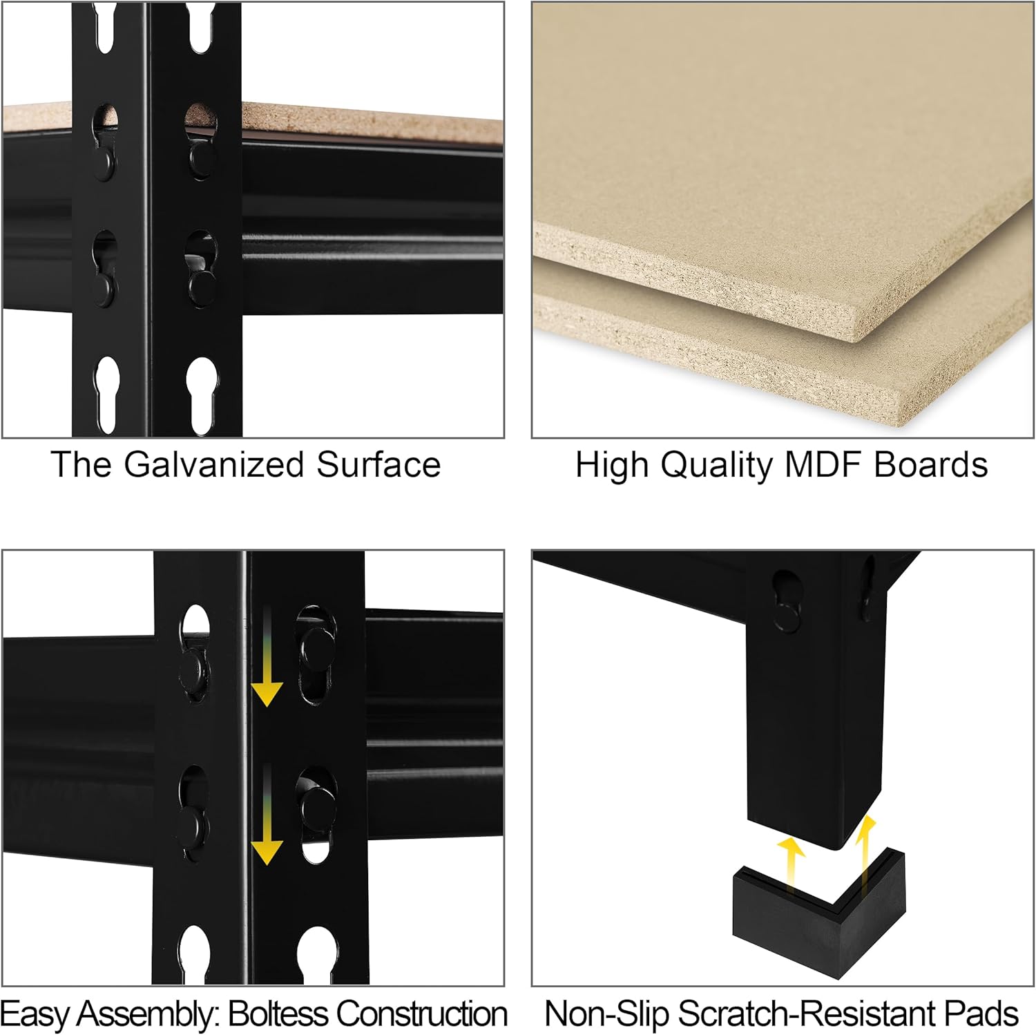 • 【 HEAVY DUTY & LONG-LASTING】 : This 5-tier garage shelving is made of high-quality 0.3" thicker MDF boards and 0.03" thicker heavy duty galvanized metal frame, sturdy and enduring. The metal frame is covered with premium powder coating to give it a smooth surface. Each shelf holds up to 265 lbs, 5 tier shelves' total max load weight is 1325 lbs