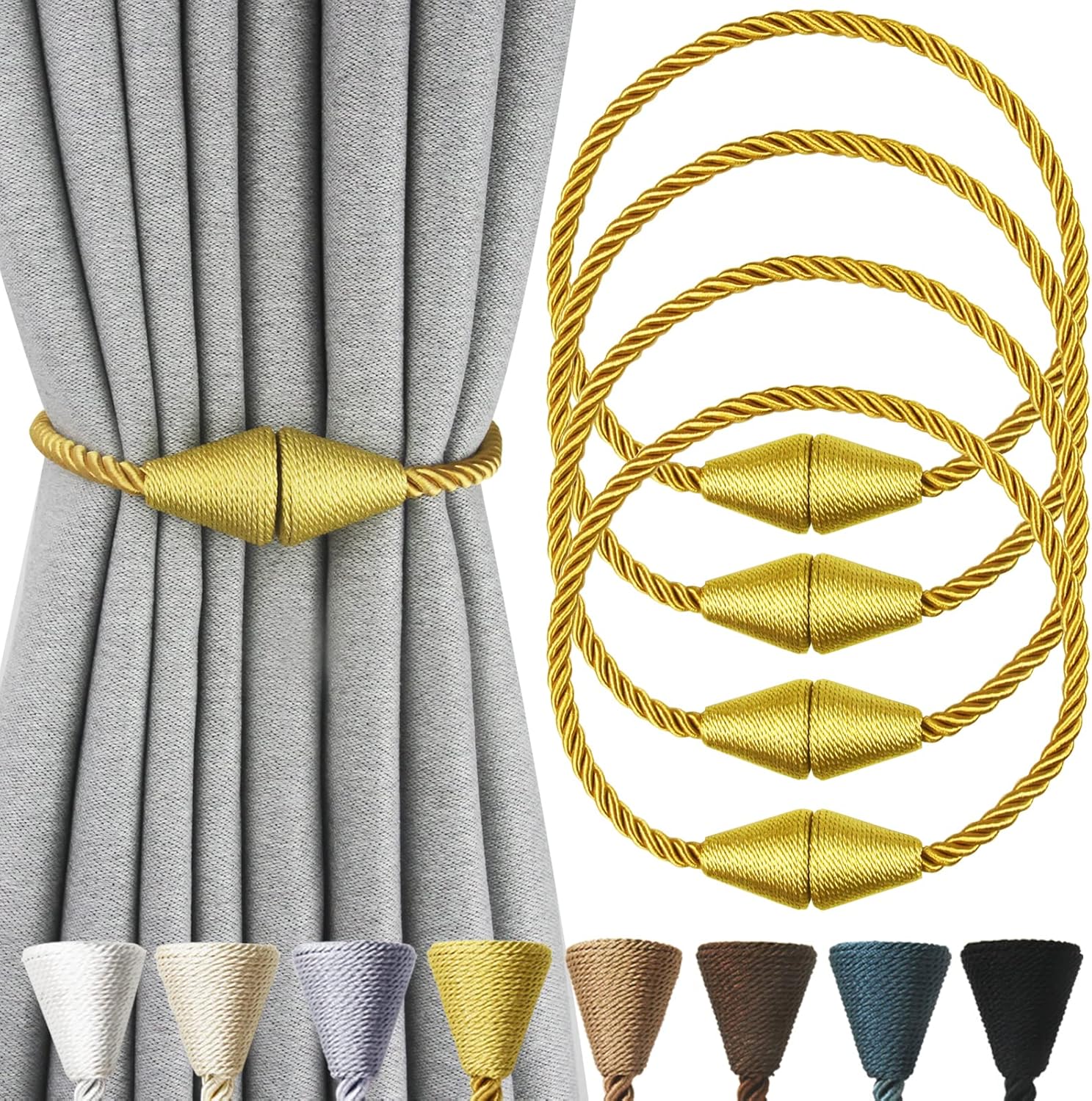 4 Pack Magnetic Curtain Tiebacks Rope Modern Handmade Curtain Tie Backs Decorative Drapes Weave Holdbacks for Window Décor, Gold