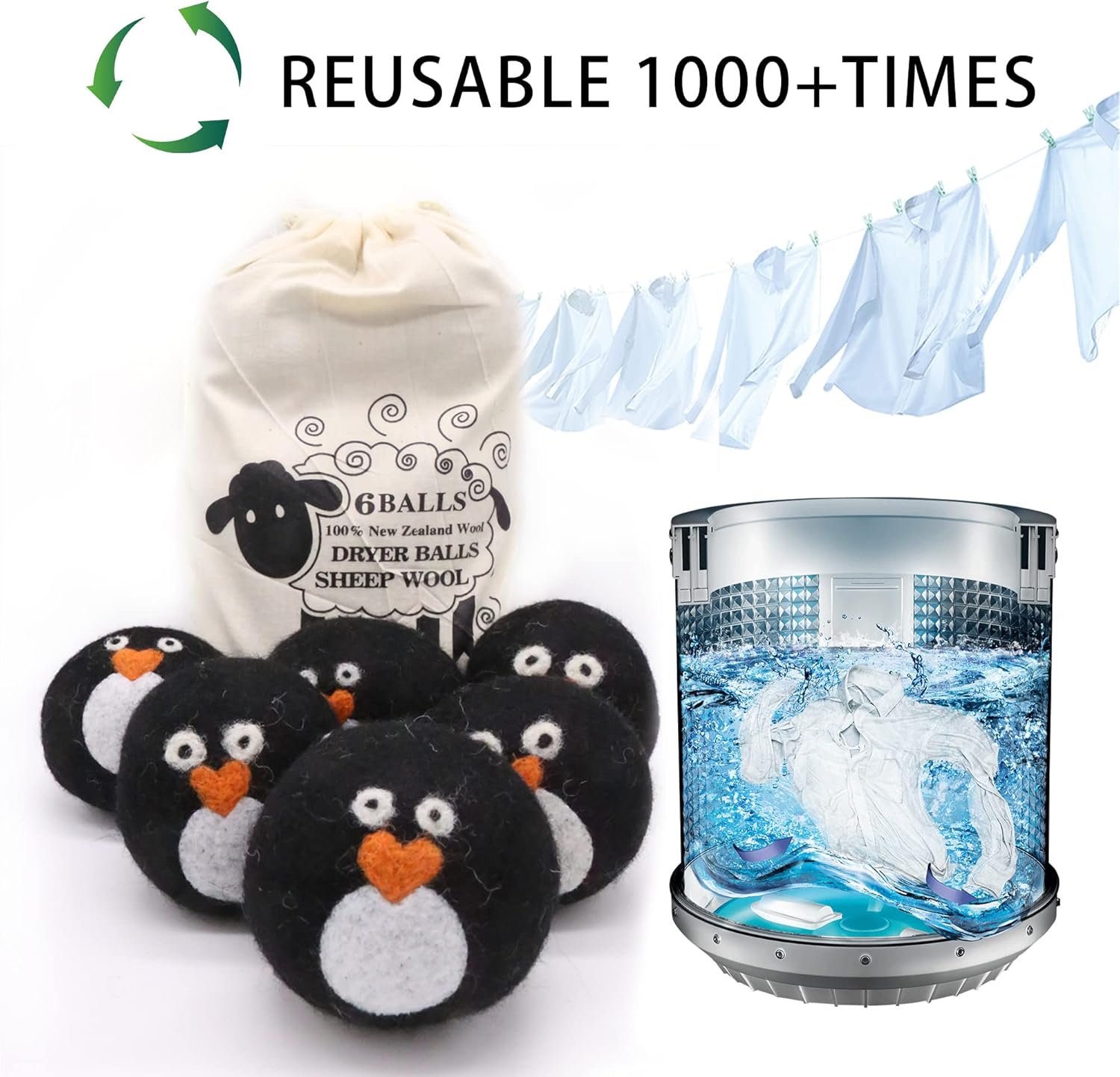 Pack of 6 Wool Dryer Balls, Muulaii Reusable Fabric Softener, Extra Large, Black Penguin