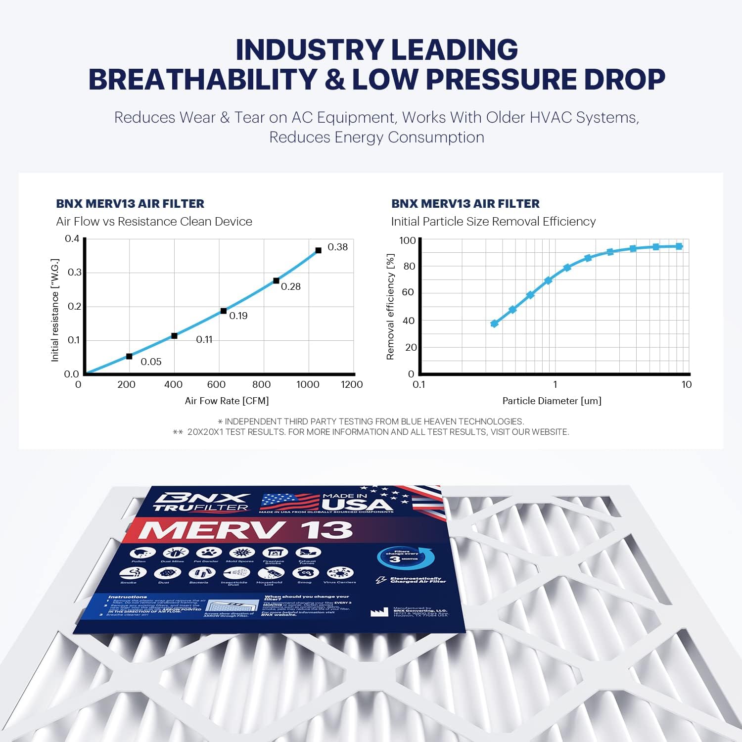 • SUPERIOR PERFORMANCE - The BNX MERV 13 100% synthetic electrostatically charged air filter media outperforms standard fiberglass filters and adopts the latest in electrostatic filtration technology to allow for industry leading superior low air flow resistance while maintaining the highest grade level of filtration.